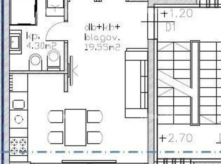 U vili D nalazi se stan ukupne površine 67,21 m², smješten na 1. katu zgrade. Stan ima unutarnju površinu od 45,60 m² te se sastoji od ulaznog hodnika, kuhinje, dnevnog boravka i blagovaonice s izlazom na terasu, dvije spavaće sobe i kupaonice.