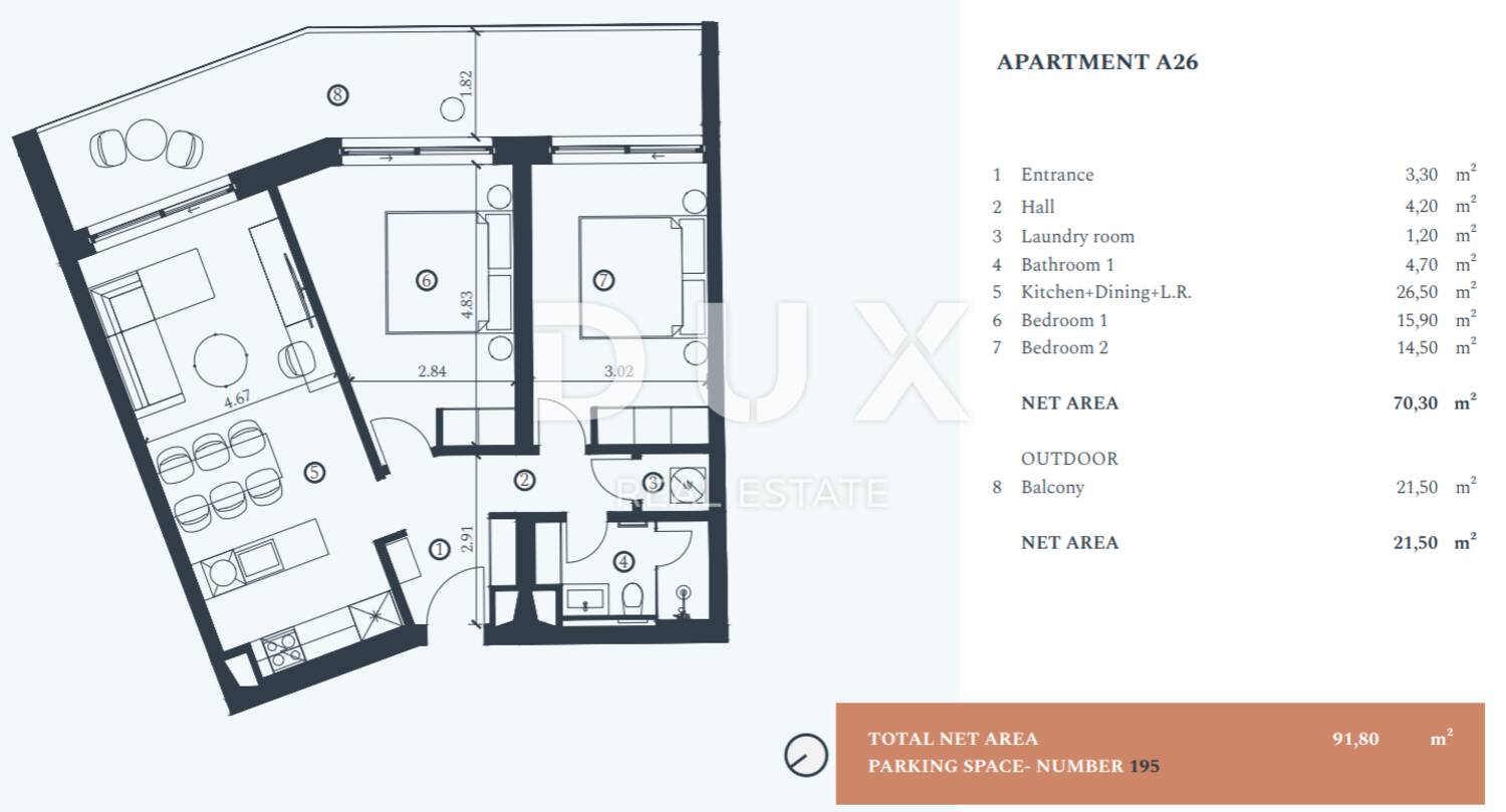 Kvadrature:91,80m2=70,30 unutarnji prostor+21,50 balkon