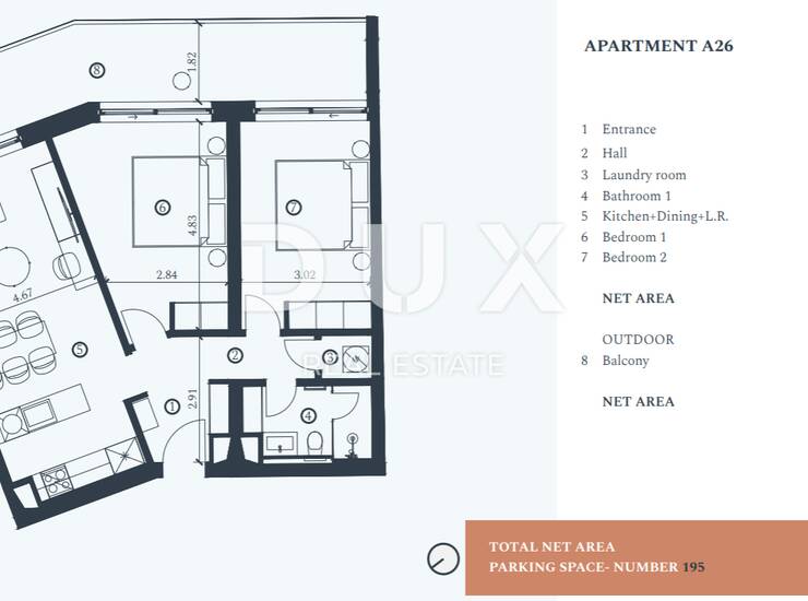 Prodaje se prostrani moderno opremljen apartman smješten u mirnom okruženju, na atraktivnoj lokaciji u blizini mora i na pješačkoj udaljenosti od plaža. Stan se sastoji od dvije velike spavaće sobe, jednom kupaonicom te prostranim otvorenim prostorom koji obuhvaća dnevni boravak, blagovaonicu i kuhinju. Dnevni boravak i 2 spavaće sobe povezane su velikim balkonom koji ima pogled na park. Apartmanu pripada 1 parkirno mjesto.