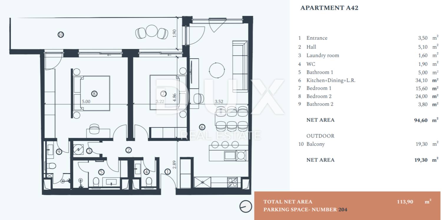Kvadrature:113,90m2=94,60 unutarnji prostor+19,30 balkon