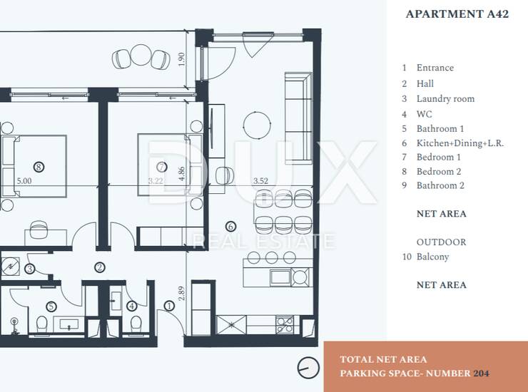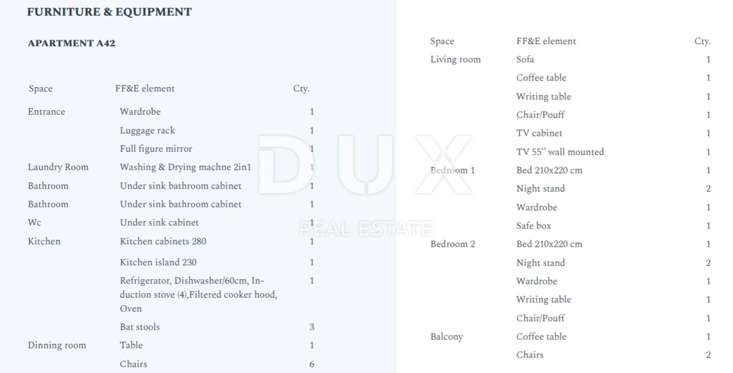 Prodaje se prostrani moderno opremljen apartman smješten u mirnom okruženju, na atraktivnoj lokaciji u blizini mora i na pješačkoj udaljenosti od plaža. Stan se sastoji od dvije velike spavaće sobe, dvije kupaonice od kojih je jedna povezana sa većom spavaćom sobom, i dodatnim WC-om te prostranim otvorenim prostorom koji obuhvaća dnevni boravak, blagovaonicu i kuhinju. Dnevni boravak i 2 spavaće sobe povezane su velikim balkonom koji ima pogled na more. Apartmanu pripada 1 parkirno mjesto.