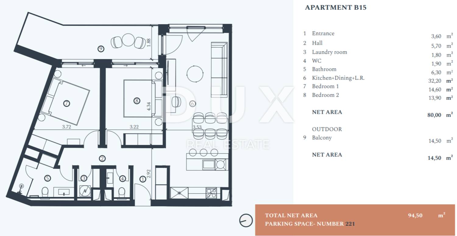 Kvadrature:94,50m2=80,00 unutarnji prostor+14,50 balkon