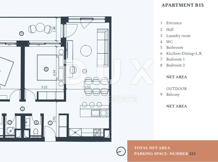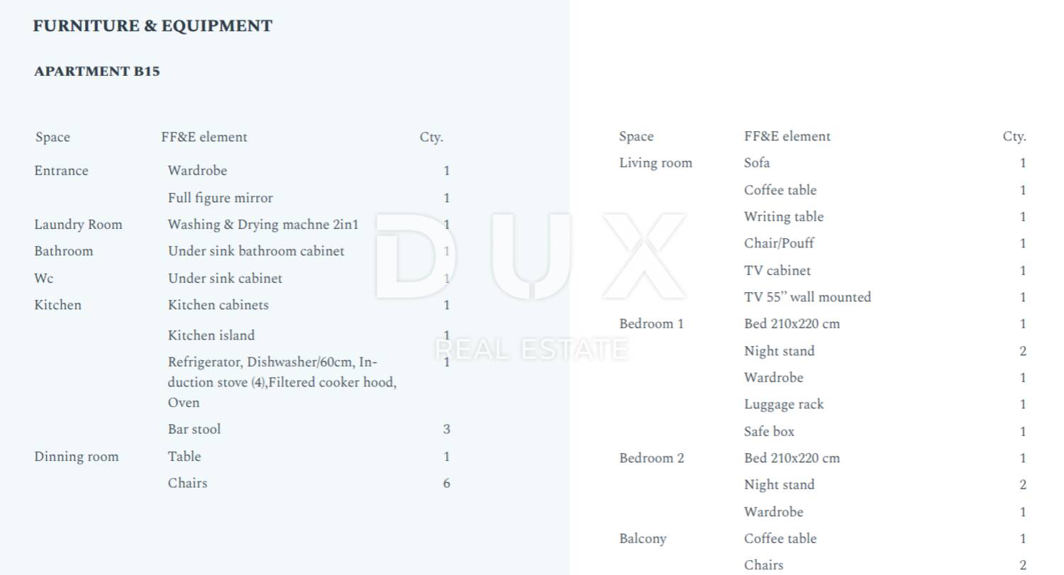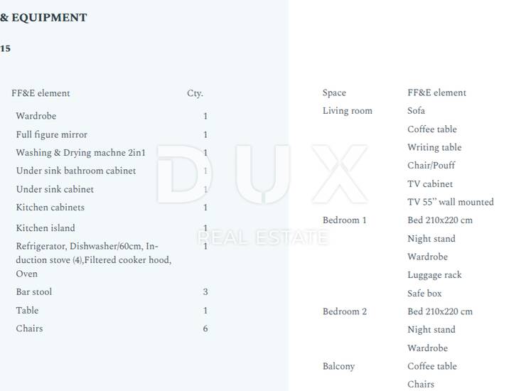 Prodaje se prostrani moderno opremljen apartman smješten u mirnom okruženju, na atraktivnoj lokaciji u blizini mora i na pješačkoj udaljenosti od plaža. Stan se sastoji od dvije velike spavaće sobe, jednom kupaonicom, i dodatnim WC-om te prostranim otvorenim prostorom koji obuhvaća dnevni boravak, blagovaonicu i kuhinju. Dnevni boravak i 2 spavaće sobe povezane su velikim balkonom koji ima pogled na park. Apartmanu pripada 1 parkirno mjesto.