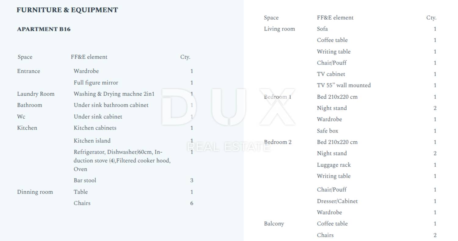 Prodaje se prostrani moderno opremljen apartman smješten u mirnom okruženju, na atraktivnoj lokaciji u blizini mora i na pješačkoj udaljenosti od plaža. Stan se sastoji od dvije velike spavaće sobe, jednom kupaonicom, i dodatnim WC-om te prostranim otvorenim prostorom koji obuhvaća dnevni boravak, blagovaonicu i kuhinju. Dnevni boravak i 2 spavaće sobe povezane su velikim balkonom koji ima pogled na park. Apartmanu pripada 1 parkirno mjesto.
