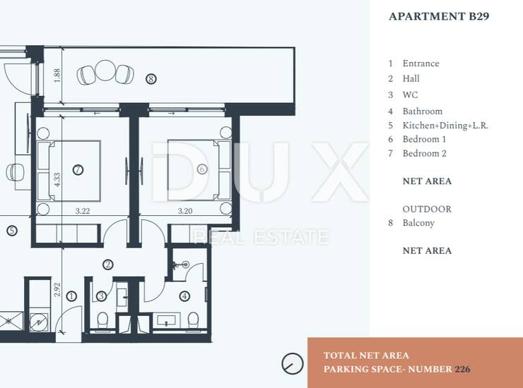 Prodaje se prostrani moderno opremljen apartman smješten u mirnom okruženju, na atraktivnoj lokaciji u blizini mora i na pješačkoj udaljenosti od plaža. Stan se sastoji od dvije velike spavaće sobe, jednom kupaonicom, i dodatnim WC-om te prostranim otvorenim prostorom koji obuhvaća dnevni boravak, blagovaonicu i kuhinju. Dnevni boravak i 2 spavaće sobe povezane su velikim balkonom koji ima pogled na park. Apartmanu pripada 1 parkirno mjesto.
