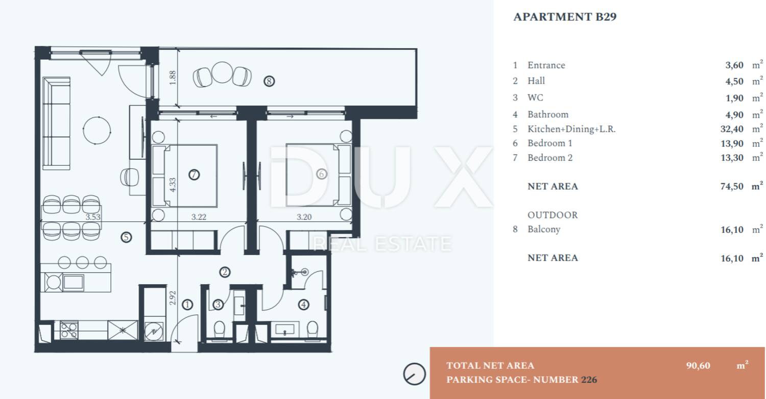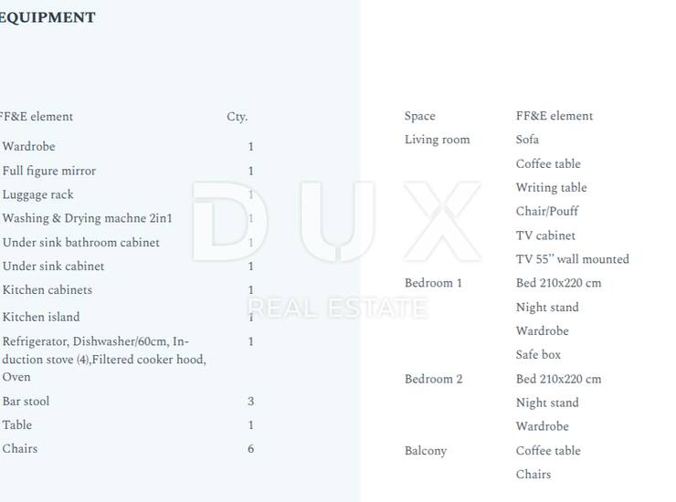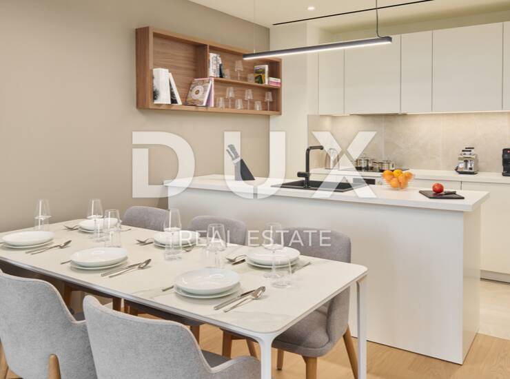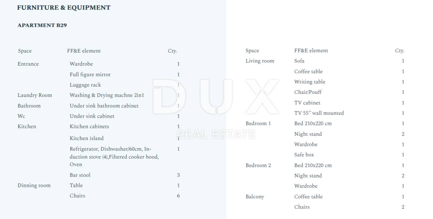 Prodaje se prostrani moderno opremljen apartman smješten u mirnom okruženju, na atraktivnoj lokaciji u blizini mora i na pješačkoj udaljenosti od plaža. Stan se sastoji od dvije velike spavaće sobe, jednom kupaonicom, i dodatnim WC-om te prostranim otvorenim prostorom koji obuhvaća dnevni boravak, blagovaonicu i kuhinju. Dnevni boravak i 2 spavaće sobe povezane su velikim balkonom koji ima pogled na park. Apartmanu pripada 1 parkirno mjesto.