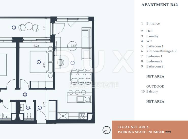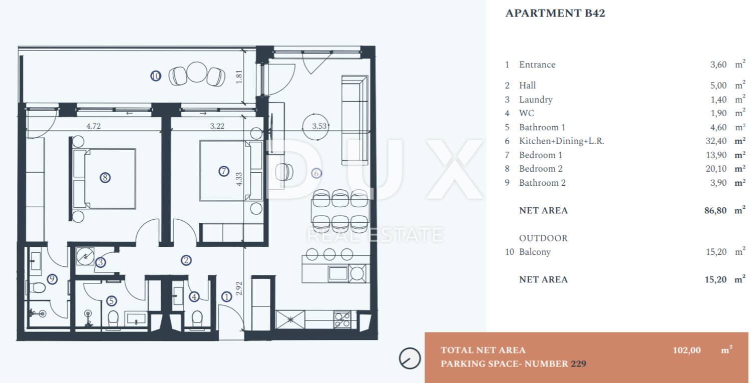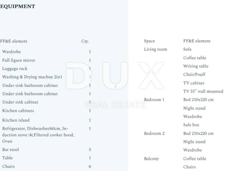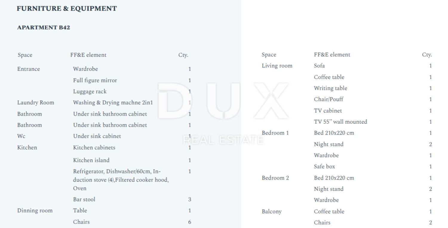 Prodaje se prostrani moderno opremljen apartman smješten u mirnom okruženju, na atraktivnoj lokaciji u blizini mora i na pješačkoj udaljenosti od plaža. Stan se sastoji od dvije velike spavaće sobe, dvije kupaonice od kojih je jedna spojena sa većom sobom, i dodatnim WC-om te prostranim otvorenim prostorom koji obuhvaća dnevni boravak, blagovaonicu i kuhinju. Dnevni boravak i 2 spavaće sobe povezane su velikim balkonom koji ima pogled na park. Apartmanu pripada 1 parkirno mjesto.