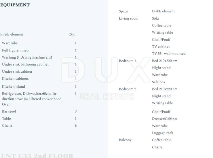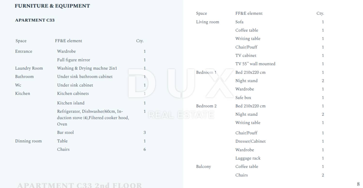 Prodaje se prostrani moderno opremljen apartman smješten u mirnom okruženju, na atraktivnoj lokaciji u blizini mora i na pješačkoj udaljenosti od plaža. Stan se sastoji od dvije velike spavaće sobe, jednom kupaonicom, i dodatnim WC-om te prostranim otvorenim prostorom koji obuhvaća dnevni boravak, blagovaonicu i kuhinju. Dnevni boravak i 2 spavaće sobe povezane su velikim balkonom koji ima pogled na park. Apartmanu pripada 1 parkirno mjesto.