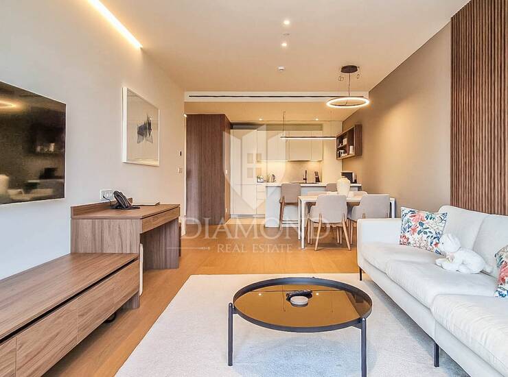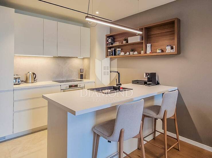 Interijer je osmišljen u modernom open space konceptu koji povezuje kuhinju, blagovaonicu i dnevni boravak u prozračnu i svijetlu cjelinu s izlazom na balkon. Apartman raspolaže jednom prostranom spavaćom sobom i suvremeno uređenom kupaonicom, a opremljen je kvalitetnim i pažljivo odabranim namještajem te modernom opremom koja zadovoljava visoke standarde luksuznog smještaja.