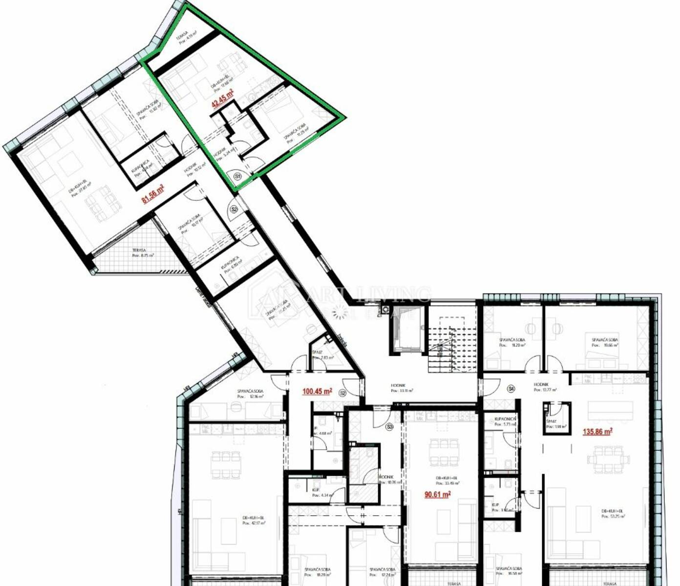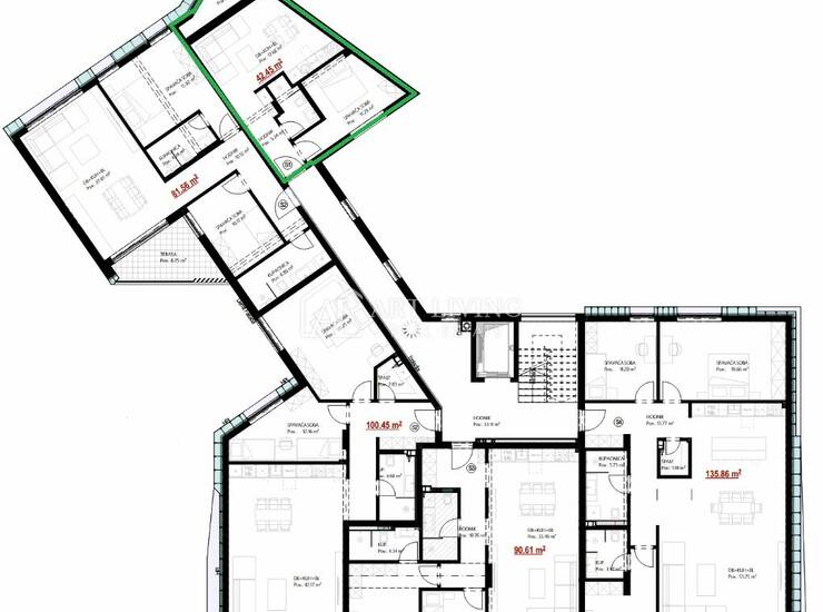 Stan je opremljen modernim sadržajima i visokokvalitetnim materijalima, čime se osigurava maksimalna udobnost i osjećaj luksuza i komfora. Sastoji se od prostranog dnevnog boravka s kuhinjom otvorenog tipa, prostrane spavaće sobe, hodnika, te kupaone opremljene tuš kabinom.