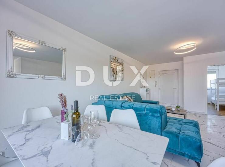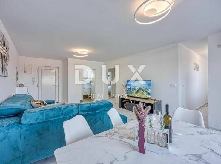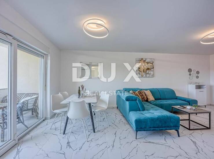 Veći stan veličine 79m2 stambenoga prostora, sastoji se od moderne i opremljene kuhinje, odvojene prostrane blagovaone i komotnog dnevnog boravka, koji također posjeduje pristup prema natkrivenoj terasi od 6m2 s predivnim pogledom na more, zalazak sunca i Alpe. Uz to stan se sastoji i od prostrane moderne kupaonice, te 3 spavaće sobe, od čega su dvije veće spavaće sobe s bračnim krevetom dok je treća soba dječja soba s krevetom na kat. Svaka soba posjeduje veliki novi klizni ormar i rasvjetu na daljinski upravljač.