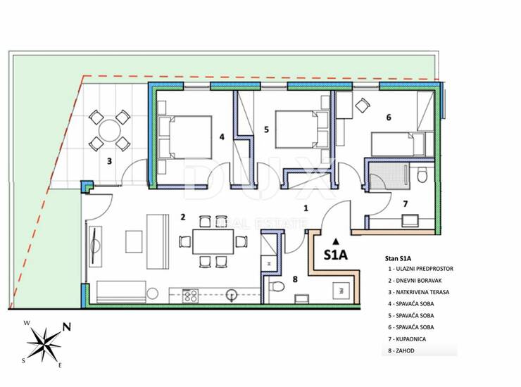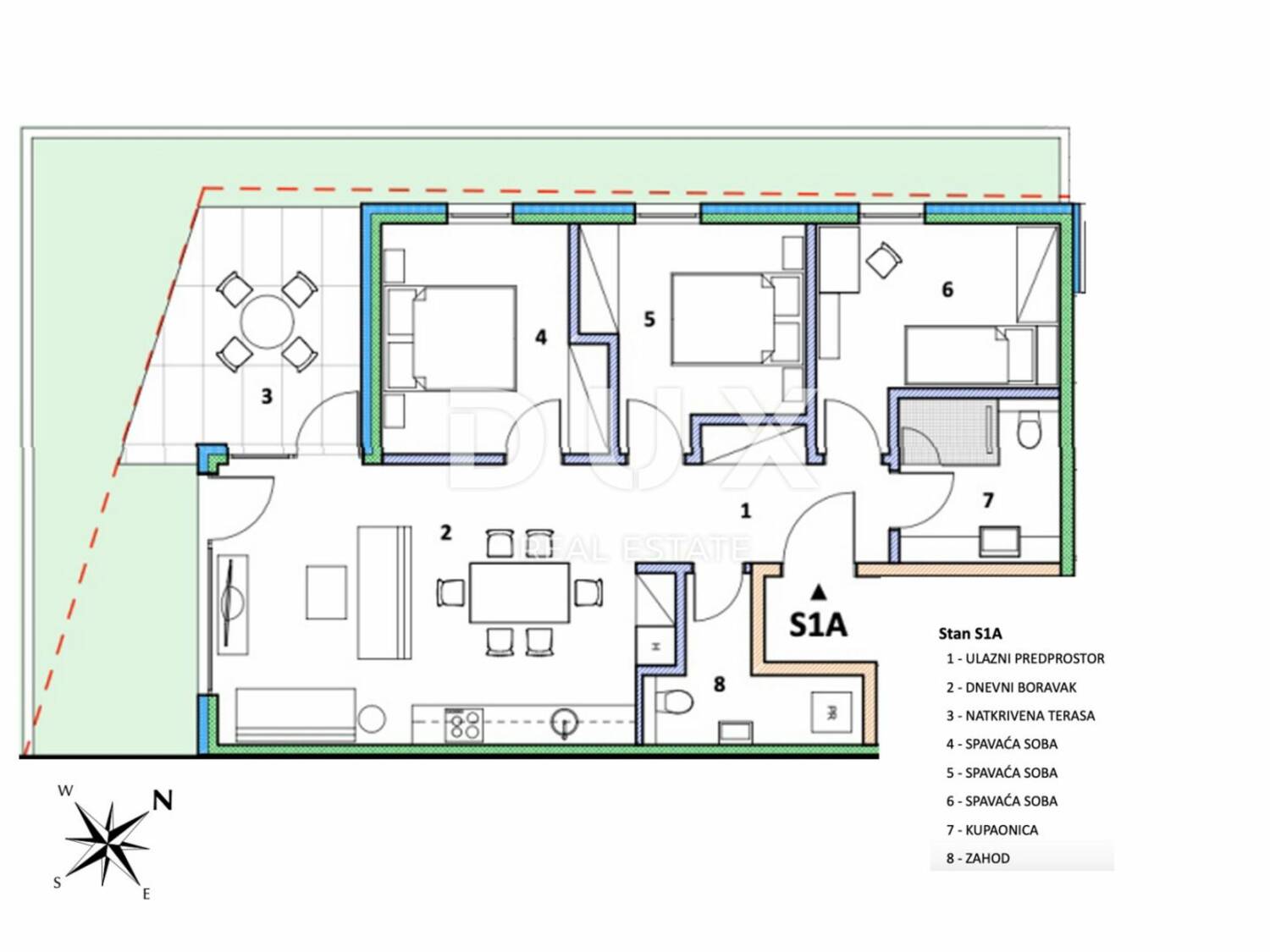Stan S1A smješten je u prizemlju kvalitetno građene zgrade s ukupno 12 stanova. Ukupne je površine 82,50 m², a sastoji se od tri prostrane spavaće sobe, otvorenog dnevnog boravka s blagovaonicom i kuhinjom, kupaonice, dodatnog gostinjskog toaleta te ulaznog predprostora. Iz dnevnog dijela izlazi se na natkrivenu i nenatkrivenu terasu – idealnu za opuštanje ili druženje na otvorenom.