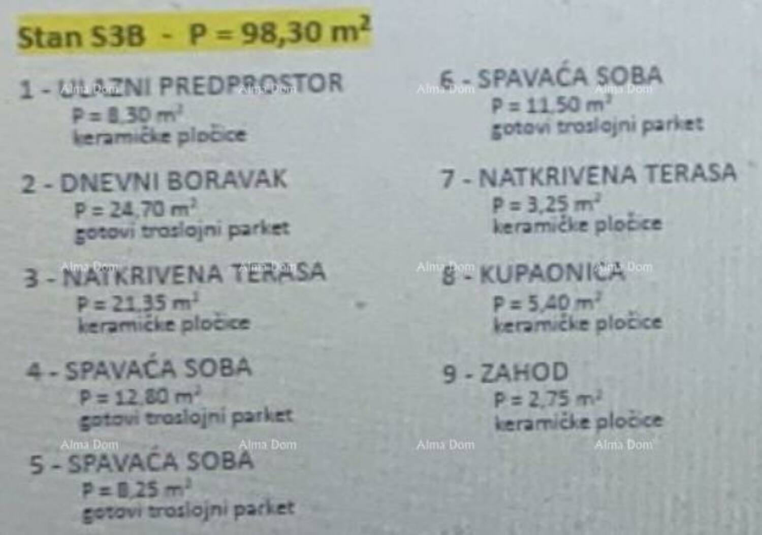 Ukupna površina stana iznosi 98,30 m², a funkcionalan raspored omogućava ugodan i praktičan svakodnevni život.