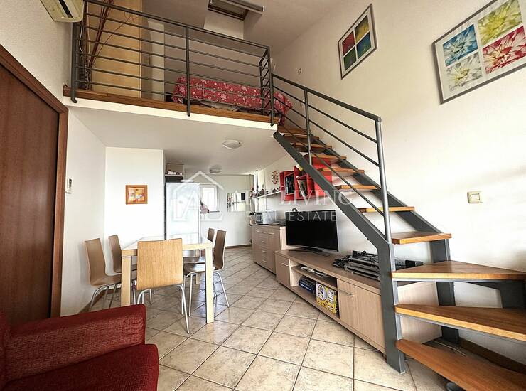 Stan ukupne površine 63 m2 se sastoji od ulaza, dnevnog boravka s kuhinjom i blagovaonicom otvorenog tipa, dvije spavaće sobe, kupatila i galerije površine 7m2 koja je trenutno preuređena u dodatnu spavaću sobu.