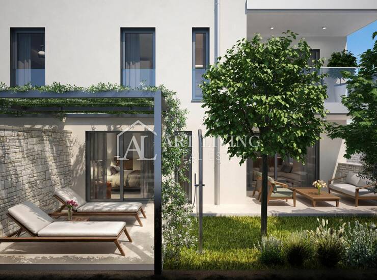 Umag, okolica - moderan stan s vrtom, 600 m od mora, NOVOGRADNJA