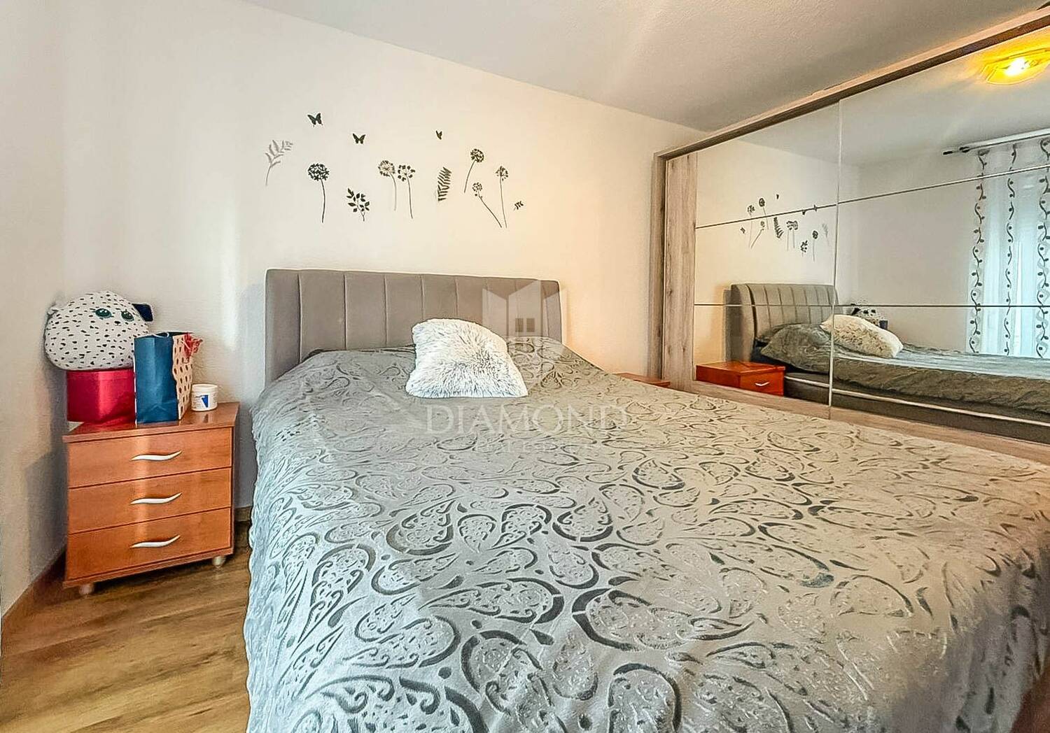 Stan se nalazi na četvrtom katu zgrade i sastoji se od kuhinje s dnevnim boravkom, dvije spavaće sobe, kupaonice te dvije terase, od kojih se s jedne pruža pogled na more. Grijanje i hlađenje osigurani su putem klima uređaja, a stan je 2018. godine potpuno adaptiran, uključujući obnovu svih elektro i vodovodnih instalacija.