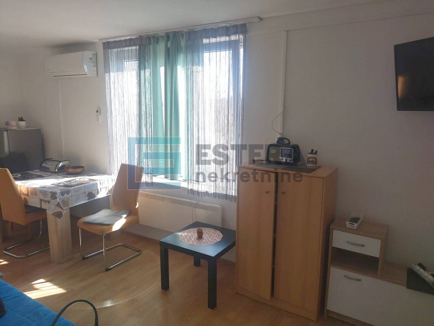 Stan je kompletno renoviran prije 3 mjeseca te se prodaje potpuno namješten sa svim uređajima. Namještaj u sobi, uključujući ležaj, potpuno je nov. Ugrađena je PVC stolarija, a grijanje je na strujne radijatore (zgrada nema plin). Stan je također opremljen klimom.