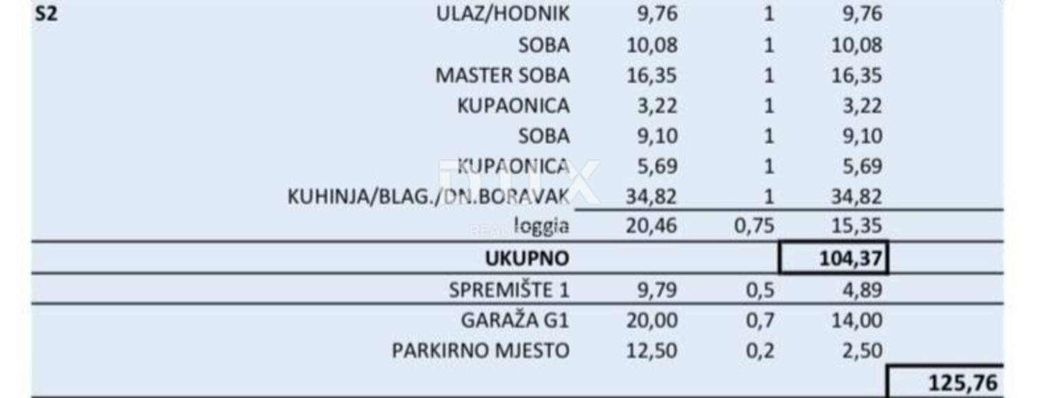 Ukupna obračunska površina stana s pripadcima iznosi 125,76 m² dok je netto korisna površina 104,37 m².