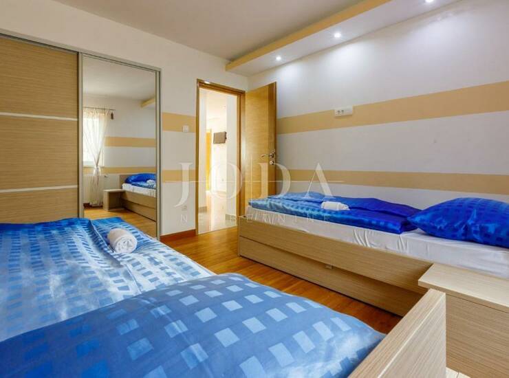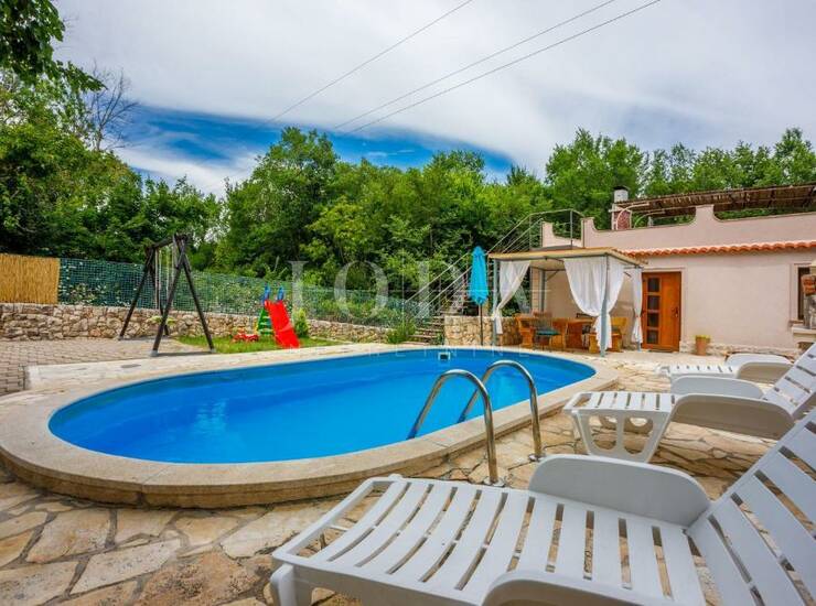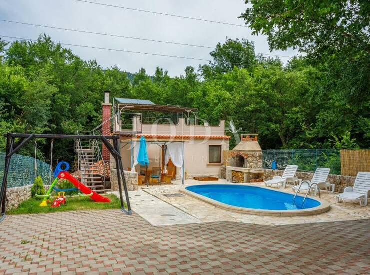 Kuća s bazenom na prodaju u Bribiru, Bribir, Vinodolska općina, Kvarner. Riječ je o potpuno uređenoj kući za odmor s lijepo održavanom okućnicom, privatnim bazenom, krovnom terasom, kamenim roštiljem i parkingom za više vozila. Nekretnina se sastoji od četiri spavaće sobe, dvije kuhinje, kupaonice, hodnika te prostrane prostorije za druženje s kaminom u prizemlju. Funkcionalan raspored omogućuje ugodan boravak većeg broja osoba, što ovu kuću čini idealnom za turistički najam, obiteljsku kuću za odmor ili investiciju na području Kvarnera. Mirna lokacija u zaleđu Crikvenice osigurava privatnost uz dobru prometnu povezanost s morem i turističkim sadržajima.