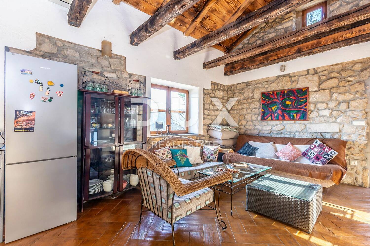 TRIBALJ, okolica Crikvenice - Dvije kamene kuće s bazenom na mirnoj lokaciji okruženoj zelenilom. Samostojeća glavna kamena kuća je prizemnica ukupne površine 98 m2. Ulaz je direktno u prostor dnevnog boravaka, kuhinje i blagovaone. S lijeve strane smještene su 2 spavaće sobe svaka sa svojom kupaonicom, od kojih je jedna kupaonica otvorenog tipa, te još jedan WC. Iznad ovog objekta smještena je jedna manja dvoetažna kućica od 40 m2, koja u prizemlju ima dnevni boravak koji je unutarnjim stubištem povezan sa sobom koja je smještena na katu, u sklopu koje je otvorena kupaonica.