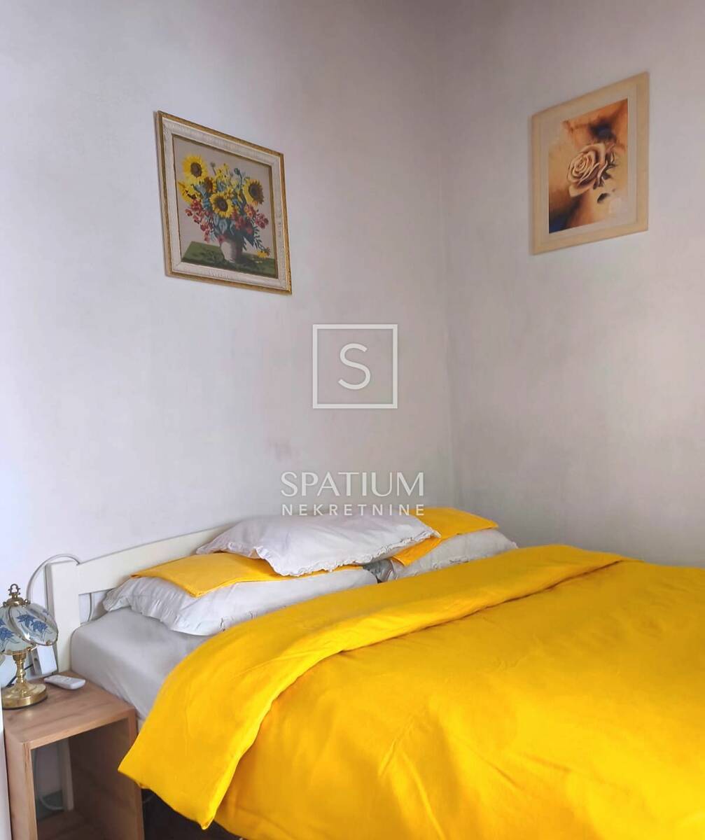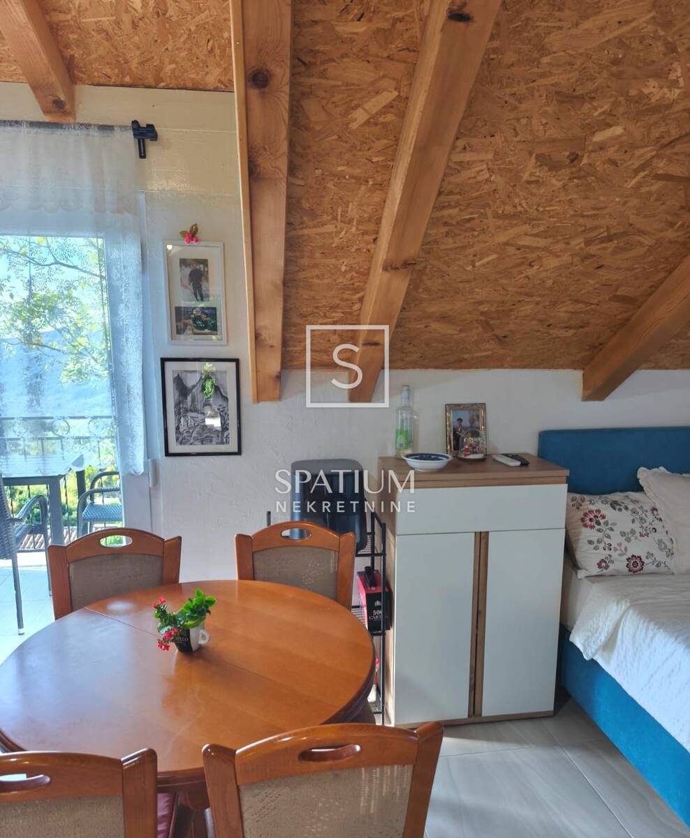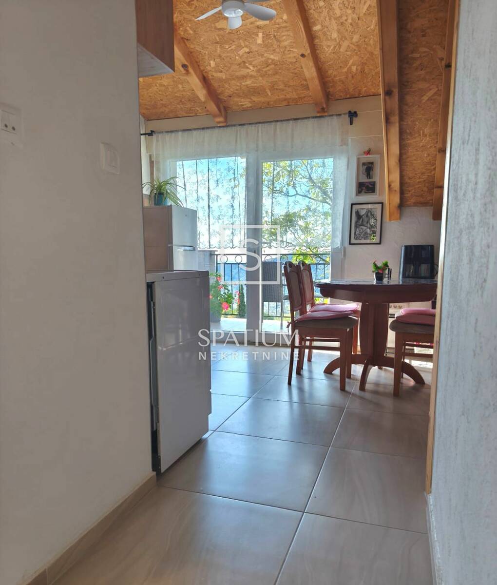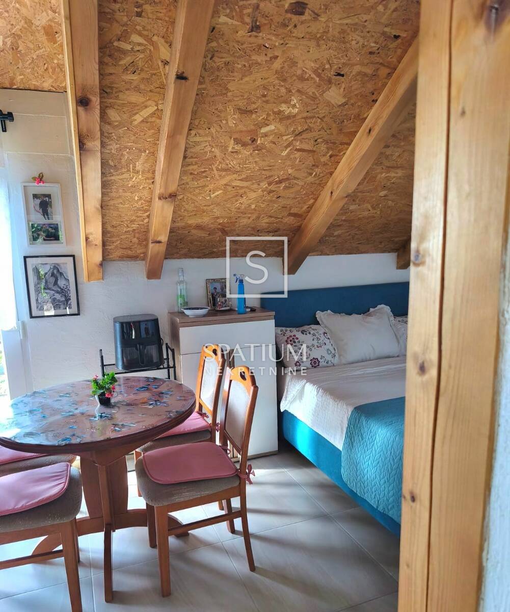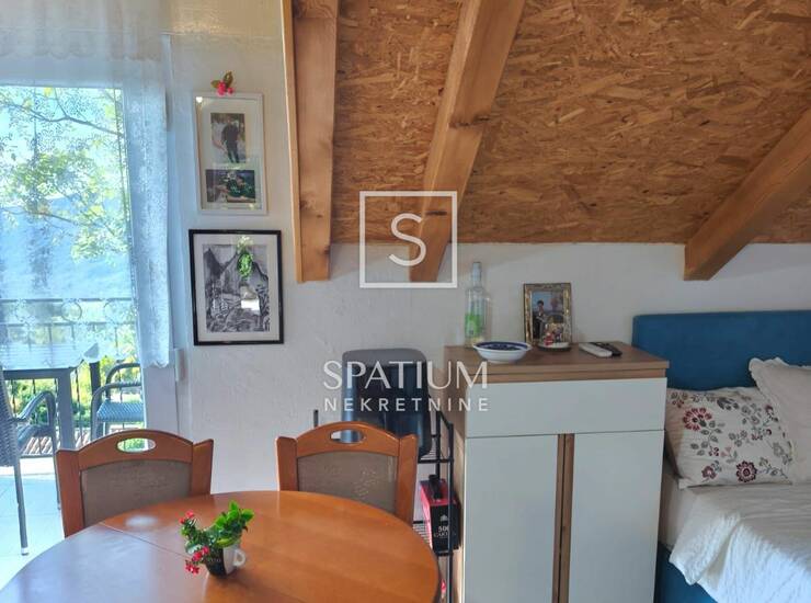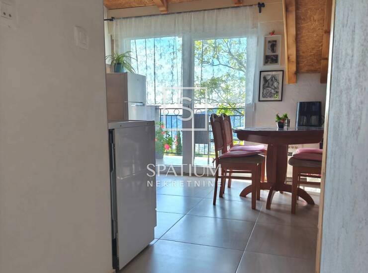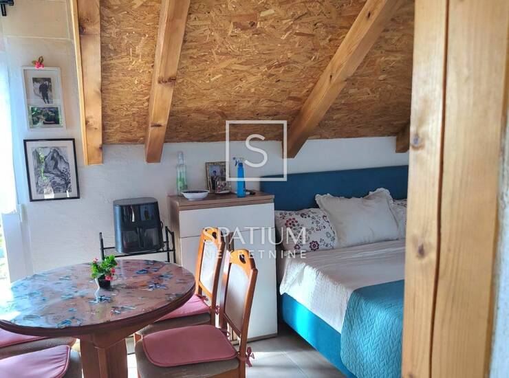 Nalazi se u visokom potkrovlju, površine 40m2, sastoji se od ulaznog hodnika, spavaće sobe, kupaonice i toaleta, kuhinje s blagovaonicom i dnevnog boravka s izlazom na balkon s kojeg se pruža lijepi pogled na more i prirodu. Pripada mu dvorišna terasa s velikim roštiljem i prostorom za druženje, površine 42m2.