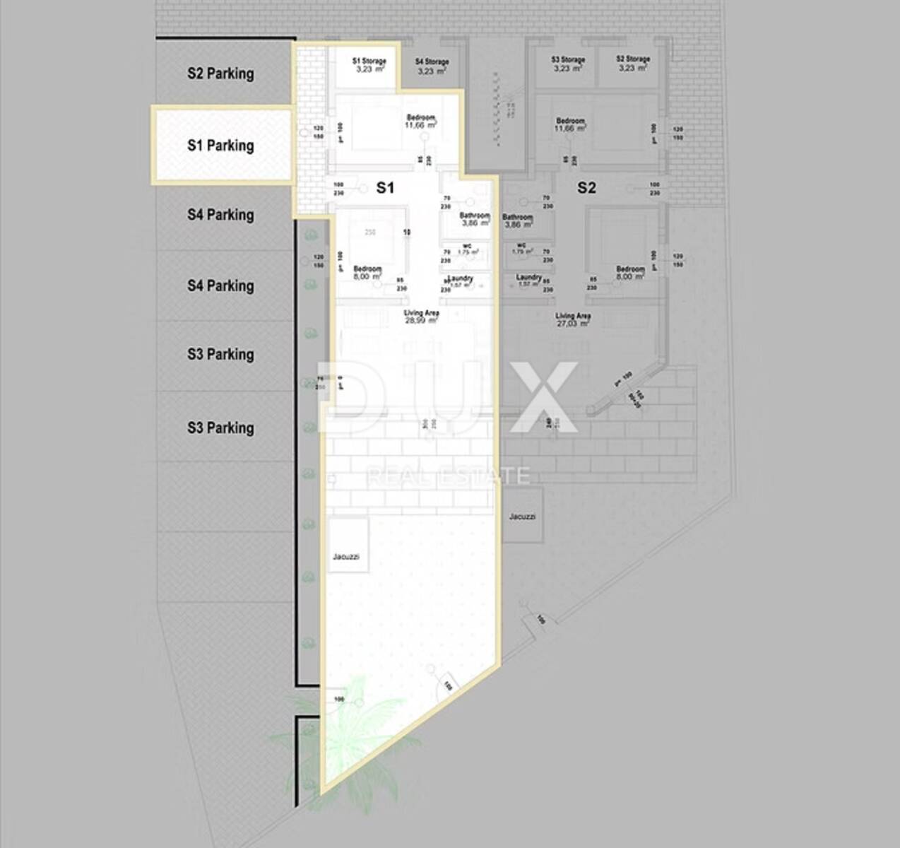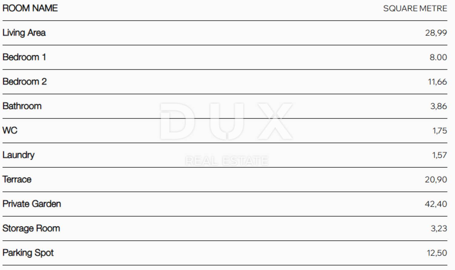 U ponudi je stan AS1 u prizemlju zgrade A – elegantan i funkcionalan stan koji se sastoji od dvije spavaće sobe, kupaonice, dodatnog WC-a, vešeraja, spremišta, prostranog dnevnog boravka s kuhinjom i blagovaonicom, natkrivene terase s predivnim pogledom na more te privatnog vrta idealnog za opuštanje. Uz stan dolazi i jedno parking mjesto. Stan nudi savršen spoj udobnosti, luksuza i blizine mora, a svaki njegov detalj pažljivo je osmišljen kako bi zadovoljio i najzahtjevnije kupce.