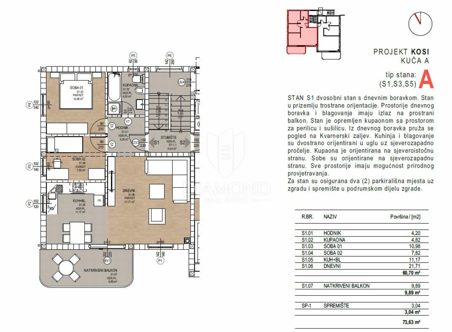 U ponudi je kvalitetan stan u novogradnji smješten u mirnom i traženom naselju Kosi na Viškovu s otvorenim pogledom na more. Stan ima 75 m² stambene površine i sastoji se od prostranog dnevnog boravka s kuhinjom i blagovaonicom, dvije spavaće sobe i kupaonice. U cijelom stanu ugrađeno je podno grijanje dok je u dnevnom boravku dodatno postavljena klima što osigurava ugodnu temperaturu tijekom cijele godine. Stanu pripadaju čak dva parkirna mjesta kao i vlastita drvarnica što dodatno povećava vrijednost ove nekretnine. Zgrada je u fazi izgradnje a završetak radova planiran je sredinom 2027. godine dok je useljenje predviđeno u prosincu 2027.