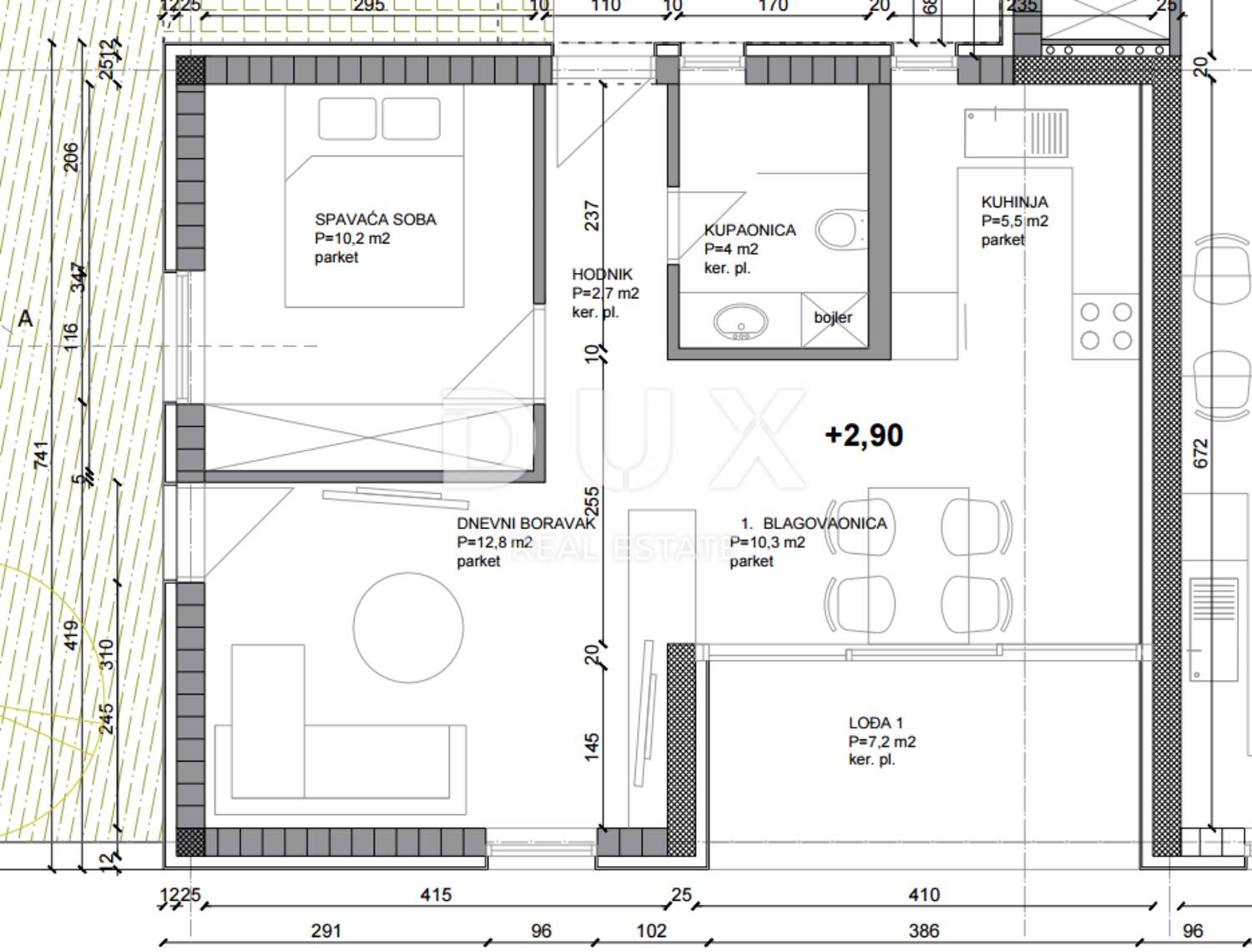 Stan će biti opremljen visokokvalitetnom keramikom, aluminijskom stolarijom i podnim grijanjem na dizalicu topline.