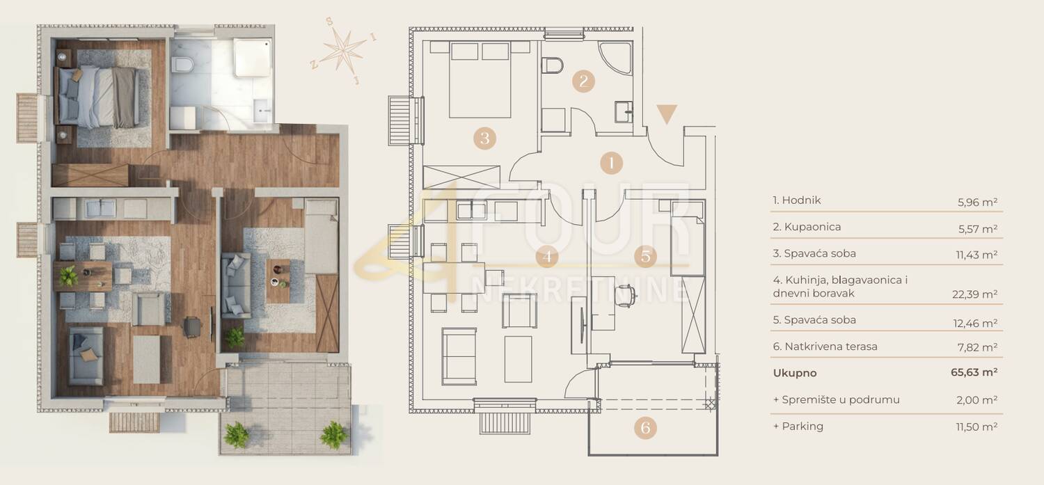 Stan ima ukupnu površinu 65.63m2, funkcionalnog je rasporeda i sastoji se od dvije spavaće sobe, dnevnog boravka s kuhinjom i blagovaonicom, hodnika i kupaonice.