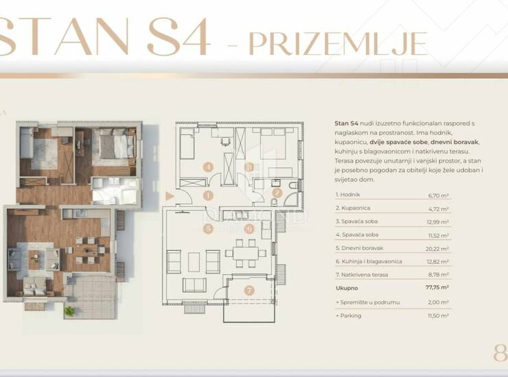 Pripada mu vlastito parkirno mjesto te spremište smješteno u suterenu zgrade.