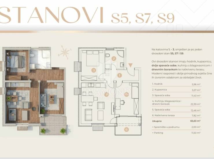 Pripada mu vlastito parkirno mjesto te spremište smješteno u suterenu zgrade.
