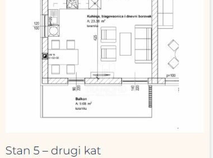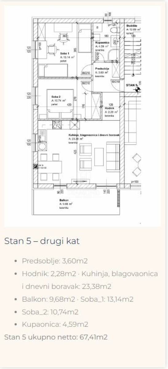 Stan na drugom katu površine 67,41 m² funkcionalnog je rasporeda te se sastoji od dnevnog boravka, kuhinje s blagovaonicom, dvije spavaće sobe i kupaonice. Iz dnevnog boravka izlazi se na lijepu terasu površine gotovo 10 m² koja pruža dodatni prostor za opuštanje i druženje.