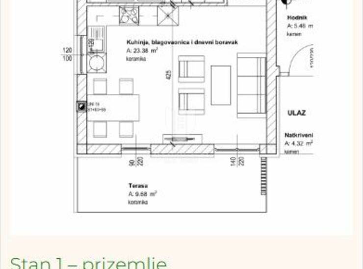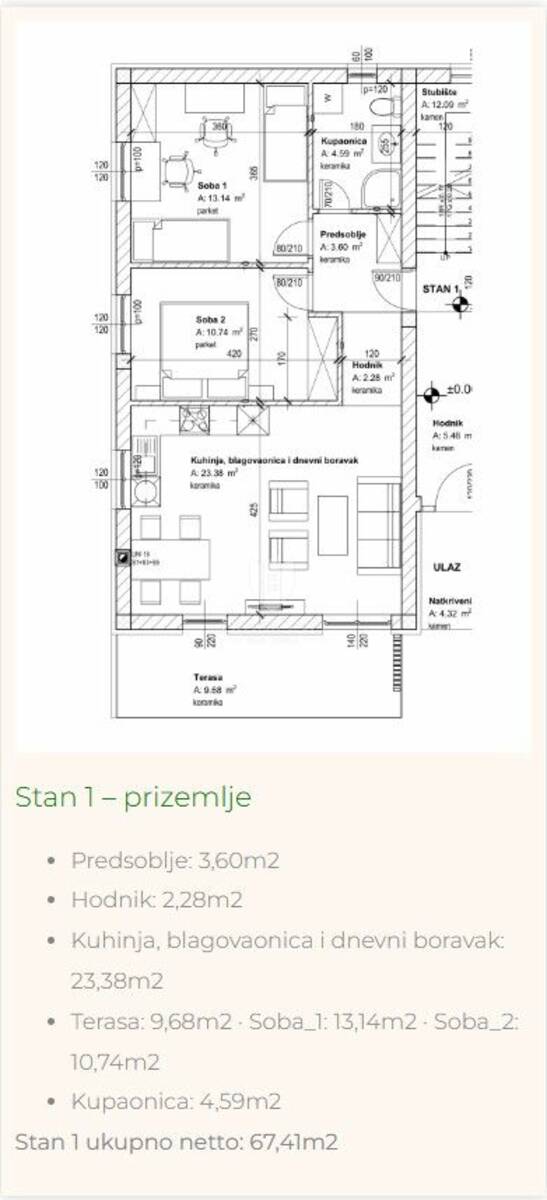 Stan u prizemlju površine 67,41 m² funkcionalnog je rasporeda te se sastoji od dnevnog boravka, kuhinje s blagovaonicom, dvije spavaće sobe i kupaonice. Iz dnevnog boravka izlazi se na lijepu terasu površine gotovo 10 m² koja pruža dodatni prostor za opuštanje i druženje.