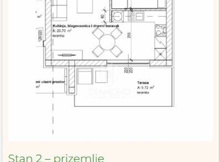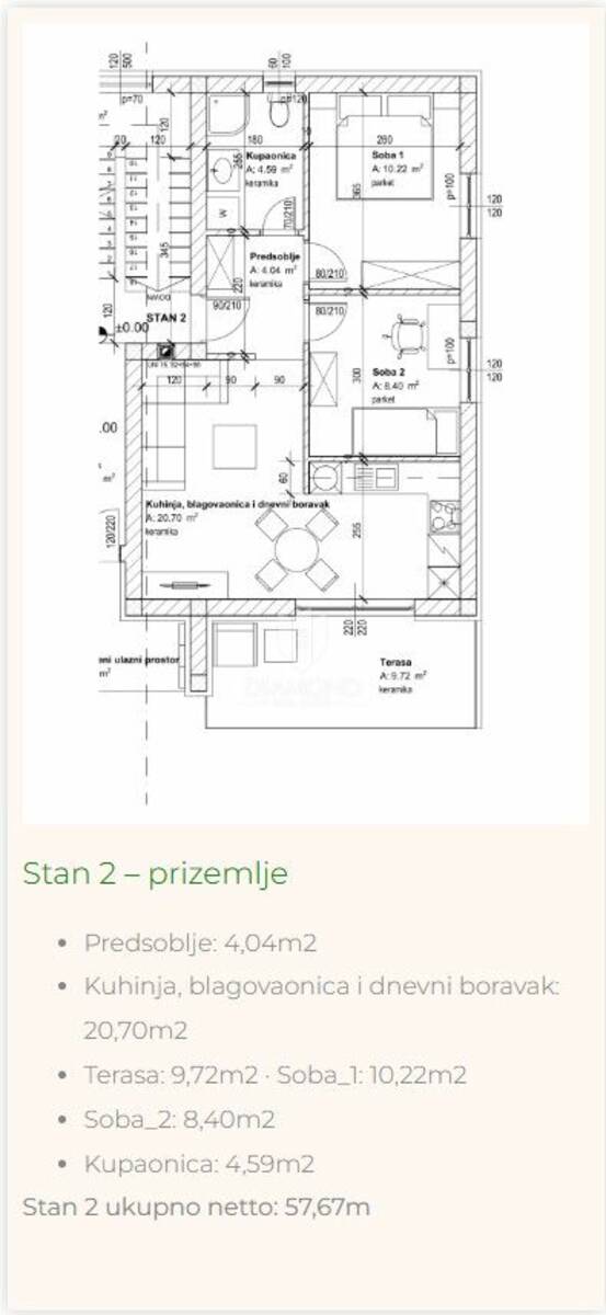 Stan u prizemlju površine 58 m² funkcionalnog je rasporeda te se sastoji od dnevnog boravka, kuhinje s blagovaonicom, dvije spavaće sobe i kupaonice. Iz dnevnog boravka izlazi se na lijepu terasu površine gotovo 10 m² koja pruža dodatni prostor za opuštanje i druženje.