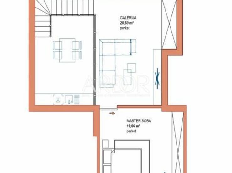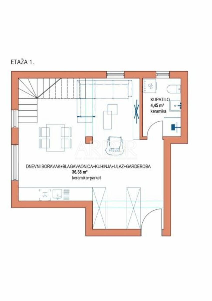Stan je vrlo funkcionalno i moderno koncipiran. Na donjoj etaži nalazi se otvoreni prostor koji objedinjuje kuhinju, blagovaonicu i dnevni boravak, kao i kupaonica s WC-om. Gornja etaža sastoji se od spavaće sobe s vlastitom kupaonicom i WC-om, dok galerijski dio nudi dodatnu sobu koja se može koristiti kao dječja soba, radni prostor ili gostinjska soba.