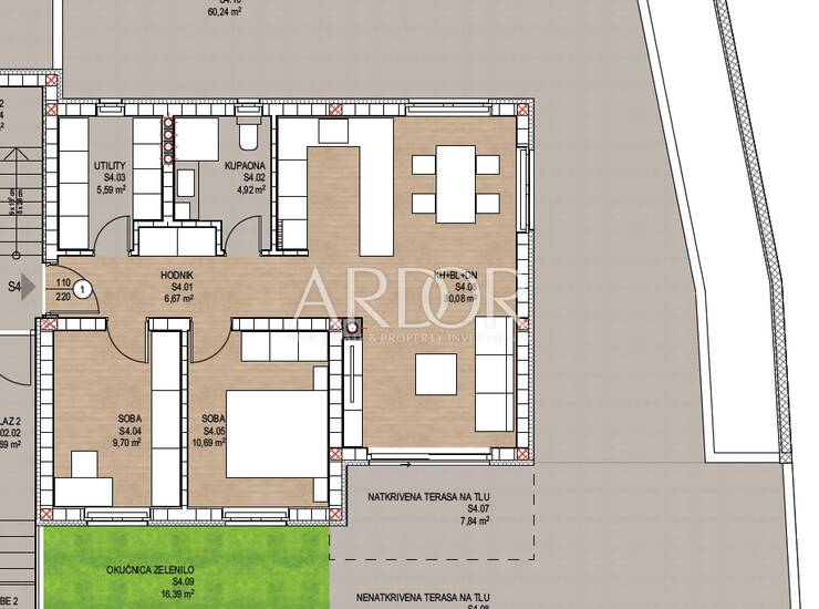 Stan je uglovni i trostrano orijentiran, čime su sve prostorije prozračne i osunčane tijekom cijelog dana. Sastoji se od dva komforna spavaća prostora, otvorenog dnevnog boravka s blagovaonicom i kuhinjom koji imaju direktan izlaz na prostranu terasu i okućnicu, kupaonice s WC-om te zasebne utility prostorije s garderobom.