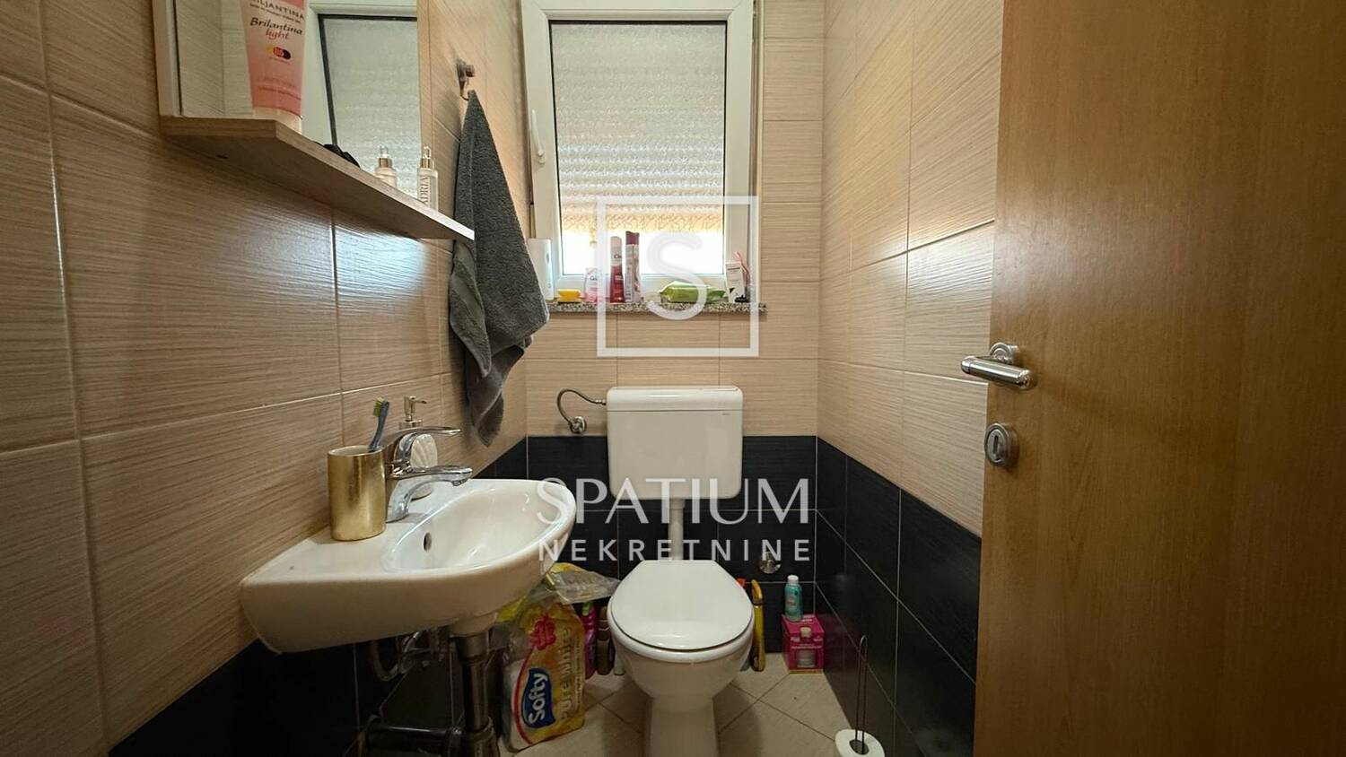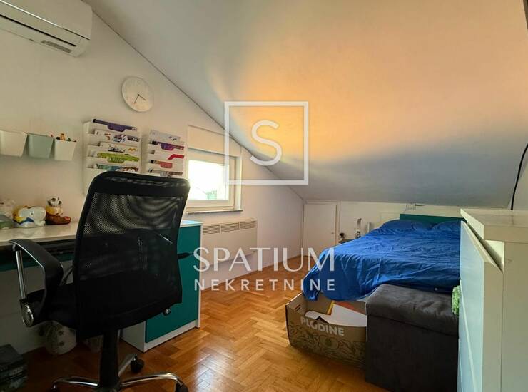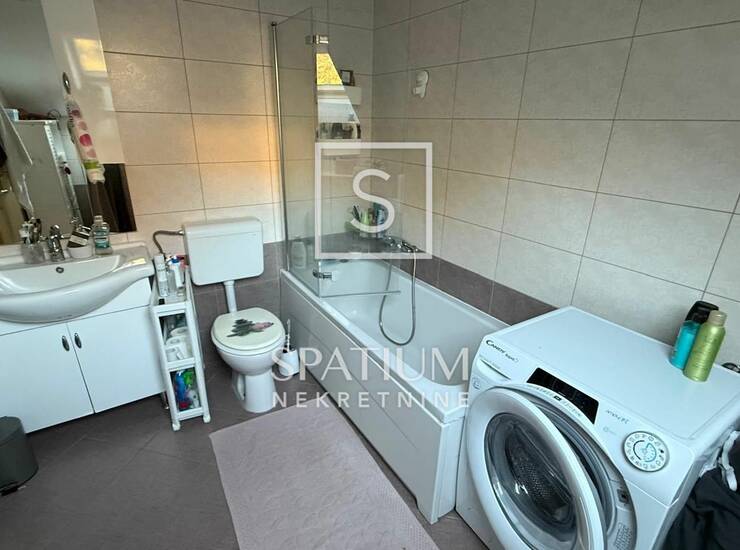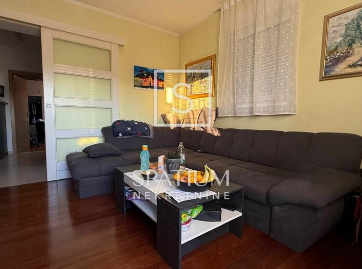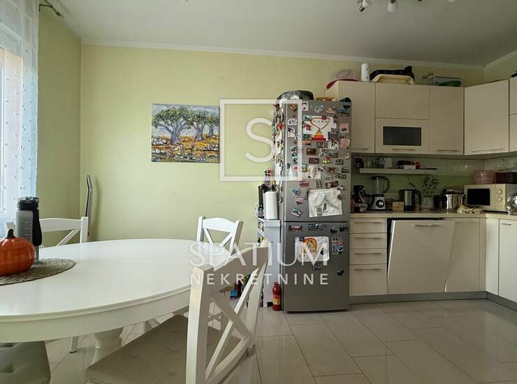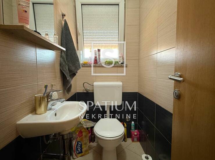 Na donjoj etaži nalazi se ulazni hodnik, dnevni boravak povezan s kuhinjom i blagovaonicom te mali WC. Na gornjoj etaži nalaze se dvije spavaće sobe, kupaonica s kadom i WC-om te dodatno spremište. Stan je potpuno uređen, klimatiziran i odmah useljiv. Prostor je svijetao i prozračan, a raspored funkcionalan i praktičan za svakodnevni život. Posebna prednost je mirno okruženje što ga čini idealnim izborom za obiteljski život ili ugodan dom za parove.