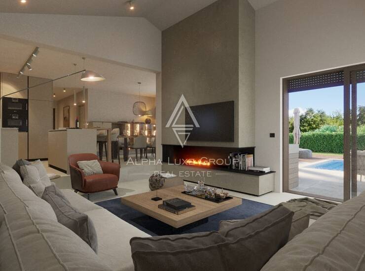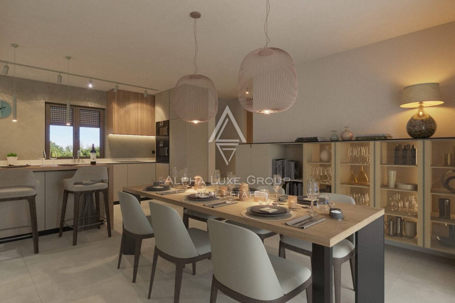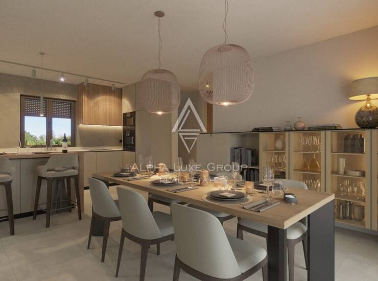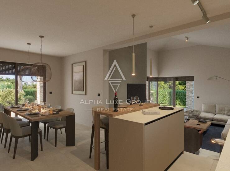 Prizemlje je osmišljeno kao ugodna otvorena stambena cjelina sa prostranim dnevnim boravkom povezanim s kuhinjom i blagovaonicom te izlazom na terasu. Na istoj etaži nalazi se jedna spavaća soba s vlastitom kupaonicom, gostinjski toalet i praktično spremište. Na katu su smještene dvije dodatne spavaće sobe, svaka s vlastitom kupaonicom, te izlaz na zajedničku terasu, idealnu za uživanje u miru i tišini.