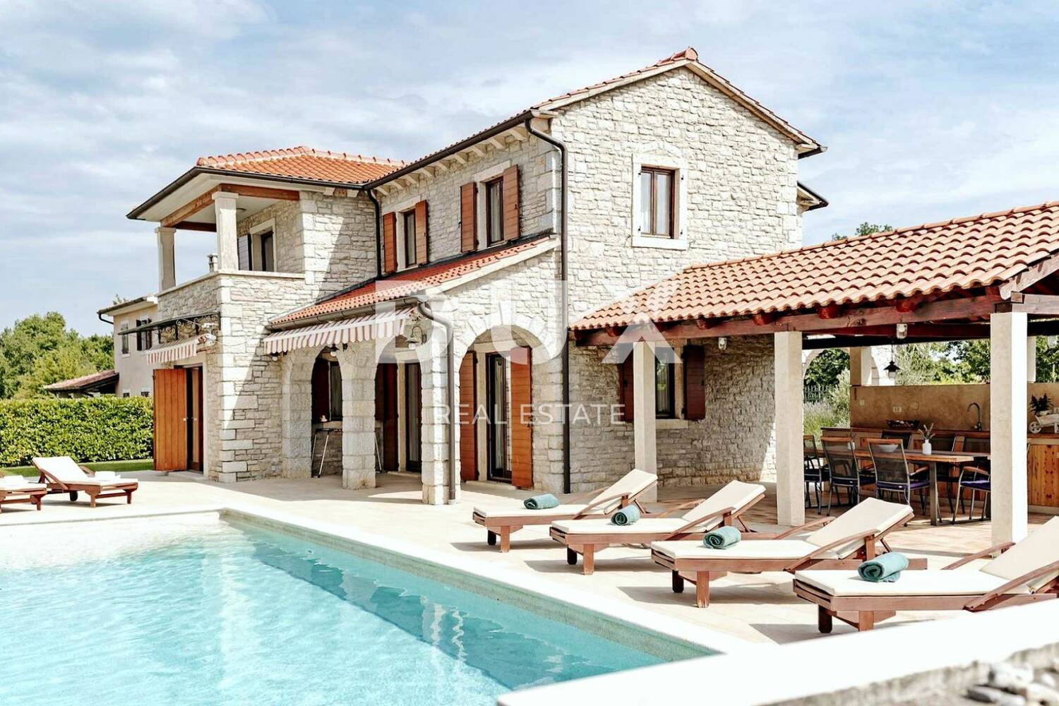 Ograđena okućnica obiluje zelenilom i mediteranskim biljem. Uz kuću se nalazi natkrivena ljetna kuhinja a savršen sklad zaokružuje bazen sa sunčalištem.
