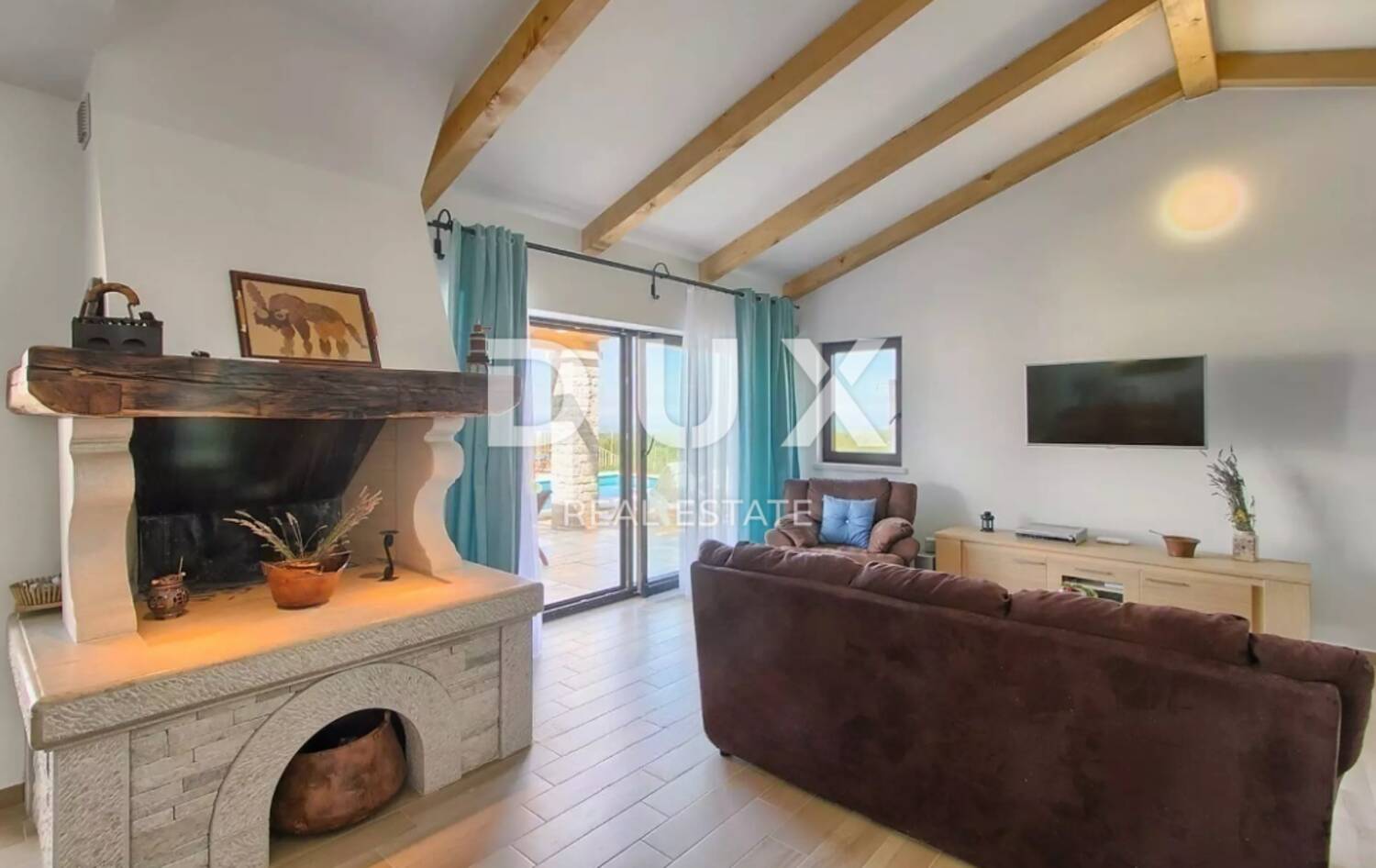 Interijer vile odiše udobnošću i prozračnošću s obiljem prirodne svjetlosti i toplinom koju dočaravaju drvene grede na visokim stropovima.