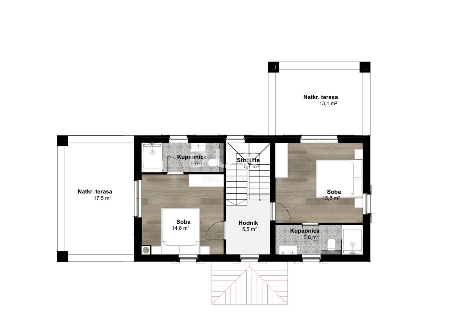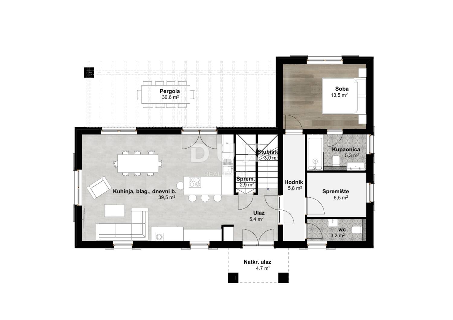 Projekt je osmišljen u suvremenom arhitektonskom stilu te uključuje funkcionalan raspored prostorija, prostrane staklene površine, terasu i privatni bazen – idealno za ugodan obiteljski život ili luksuznu kuću za odmor.