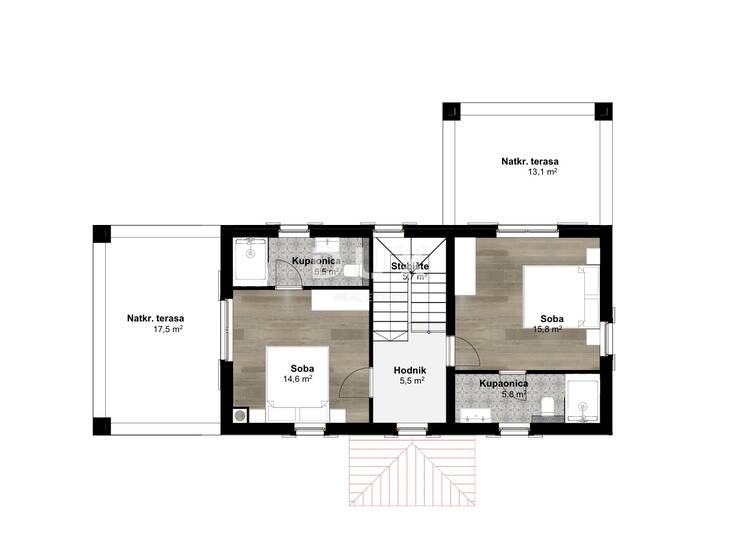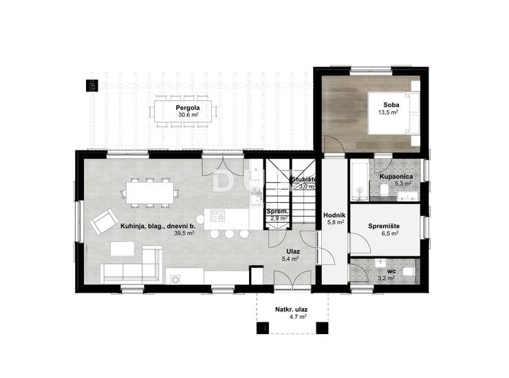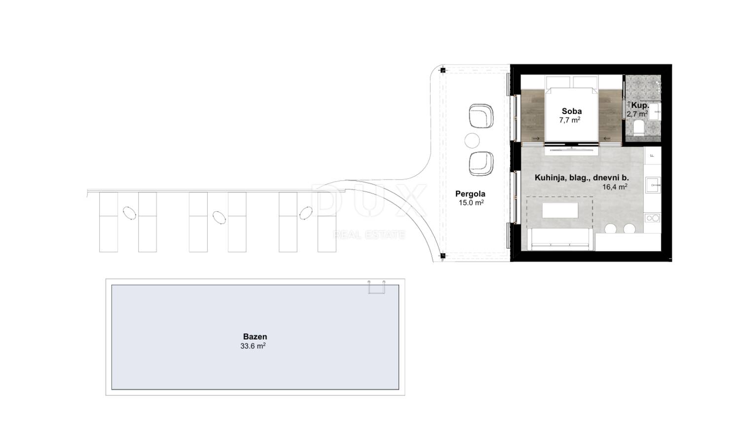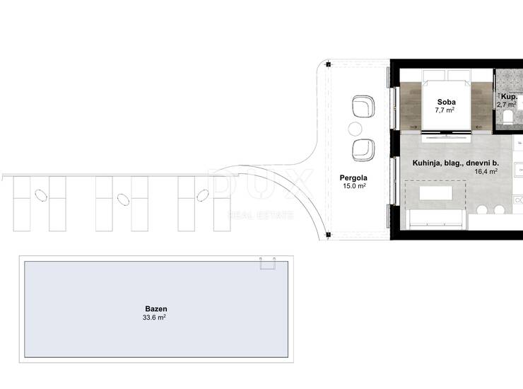 Projekt je pažljivo planiran kako bi maksimalno iskoristio parcelu i osigurao privatnost te kvalitetan