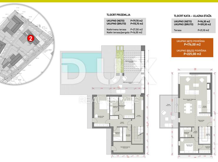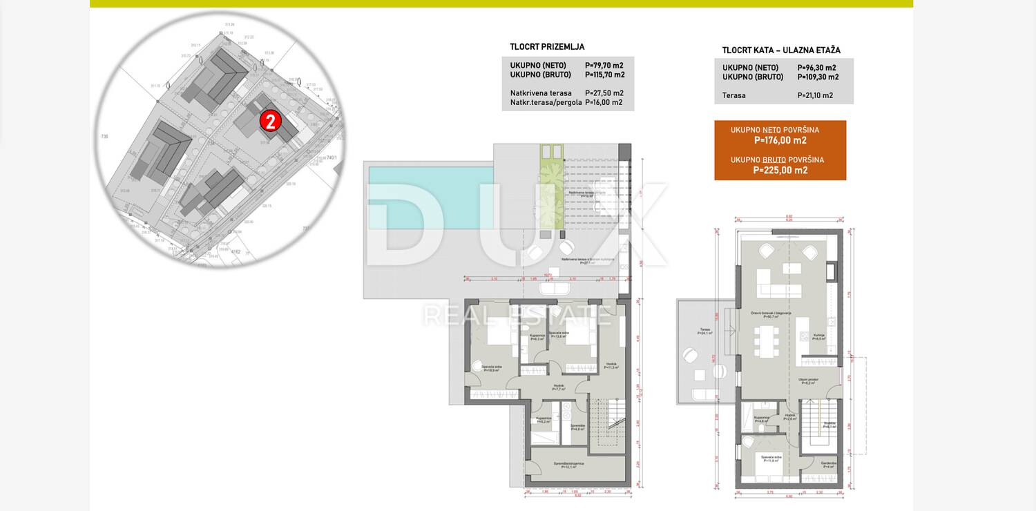 Sastoji se od kuće površine 176 m²,natkrivenim terasom od 43m2 koji sadrži ljetnu kuhinju i blagovaonicu, bazena površine 32 m² sa s