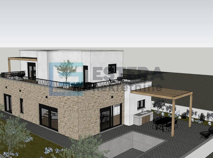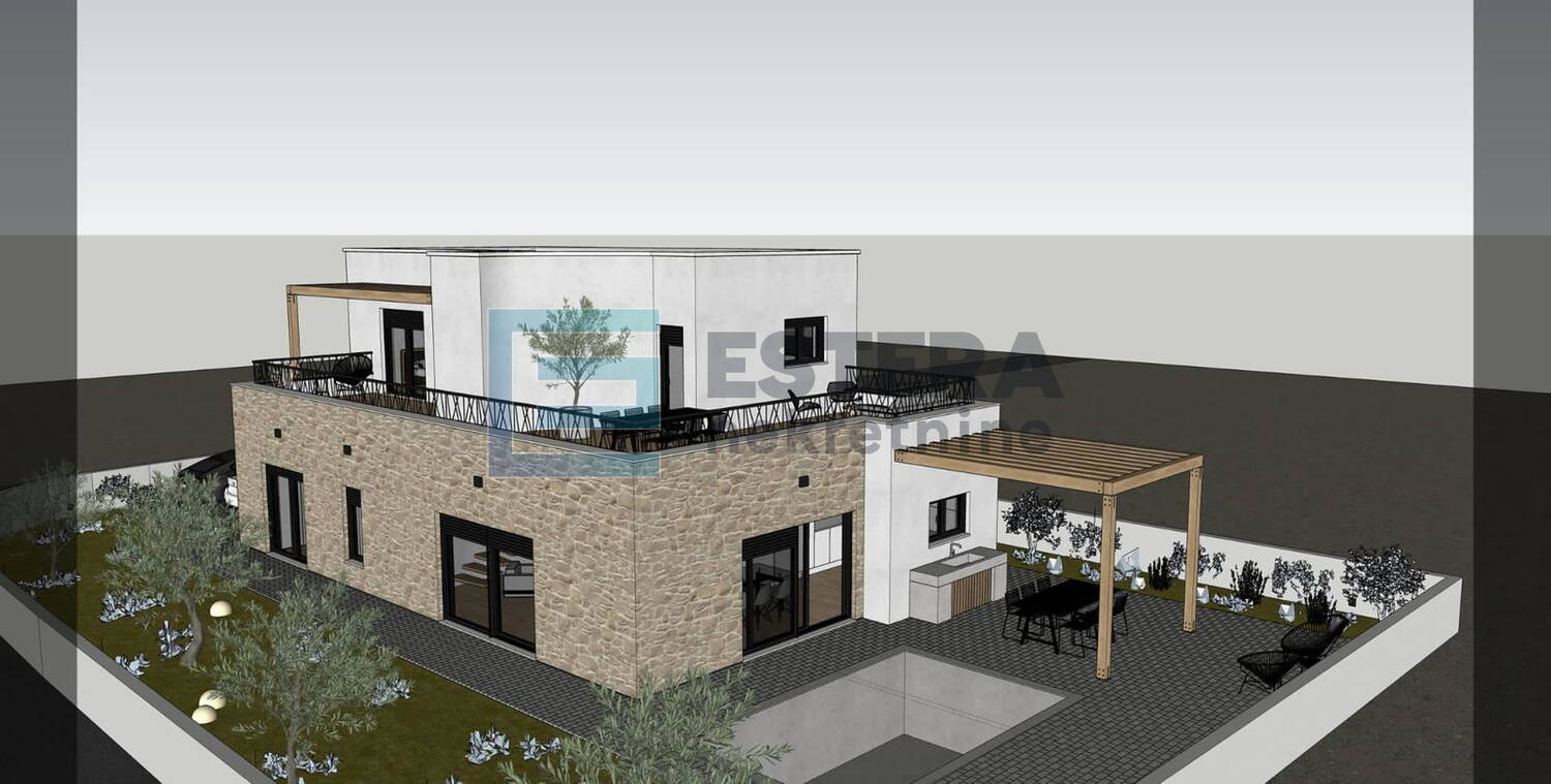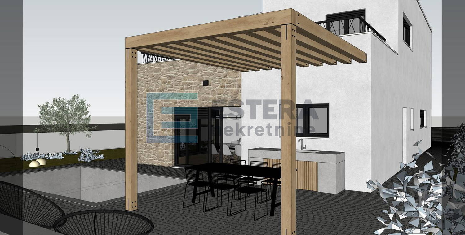 Opis: Na prodaju moderna vila s bazenom u gradu Vodice, jednom od najpopularnijih turističkih mjesta na Jadranu. Kuća se gradi na zemljištu 497 m2, ukupne neto površine 176,40 m2 raspoređene na dvije etaže.