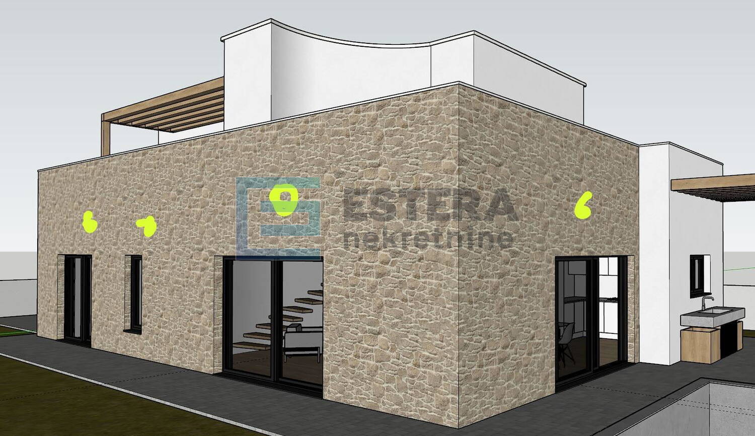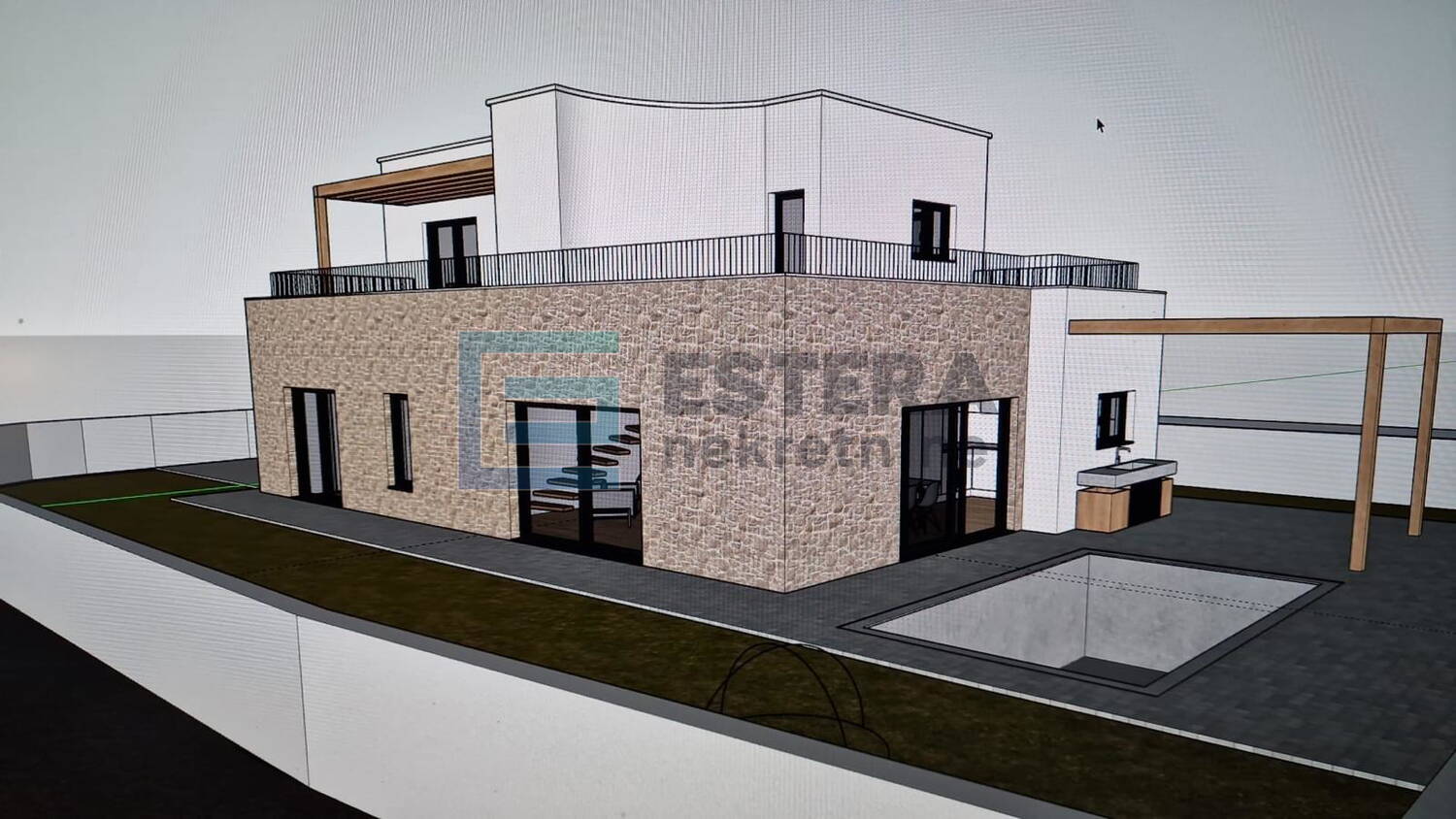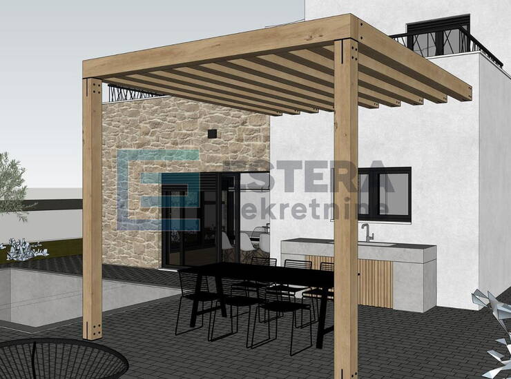 - Bazen 19,40 m2, vanjski tuš, predviđena vanjska kuhinja, roštilj, veliki natkriveni prostor za druženje, 3 parkirna mjesta.