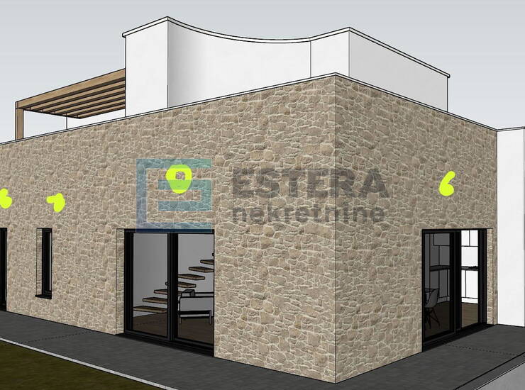 - Prizemlje (114,60 m2): ulazni hodnik, spremište, open space kuhinja s blagovaonicom i dnevnim boravkom, spavaća soba s vlastitom kupaonicom, WC, garaža 35 m2 s direktnim ulazom u hodnik, natkrivena terasa.