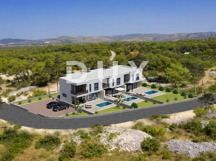 VODICE, NOVOGRADNJA, PREDIVNA DVOJNA KUĆA S BAZENOM I VRTOM