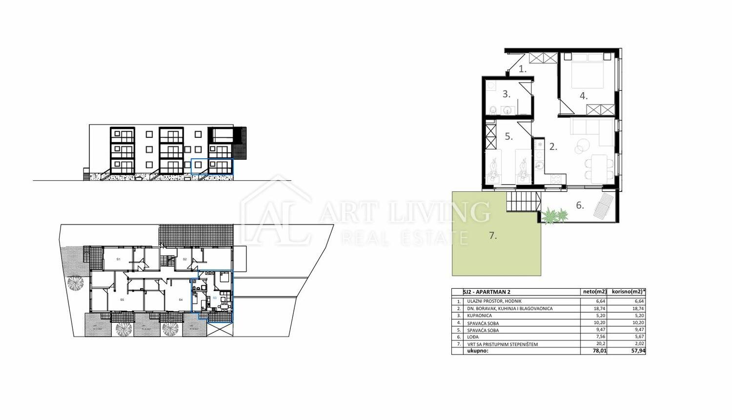 Stanu pripada i jedno garažno parkirno mjesto, jedno vanjsko parkirno mjesto te vlastiti vrt površine 20.20 m2