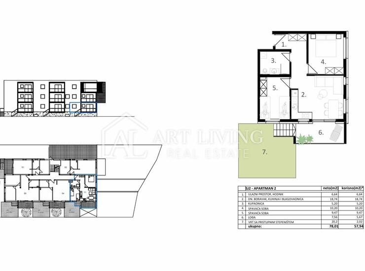 Stan SJ2, ukupne neto stambene površine 55,92 m2, smješten je u prizemlju stambeno poslovne zgrade. Sastoji se od ulaznog prostora, dnevnog boravka s kuhinjom i blagovaonicom, dvije spavaće sobe, kupaonice te loggie površine 7.56 m2