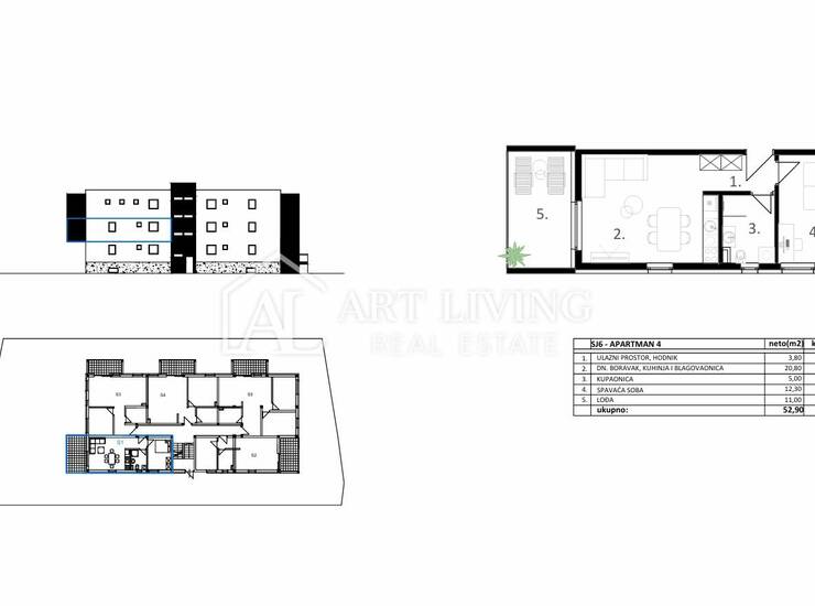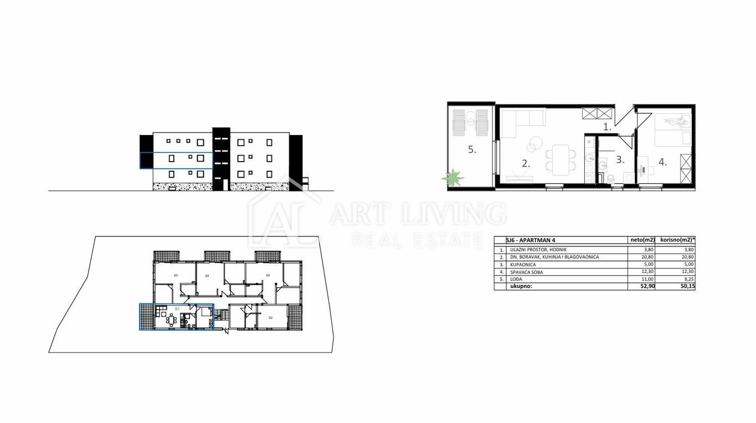 Stan SJ6, ukupne neto stambene površine 50,15 m2, smješten je na 1. katu stambeno poslovne zgrade. Sastoji se od ulaznog prostora, dnevnog boravka s kuhinjom i blagovaonicom, spavaće sobe, kupaonice te loggie površine 11 m2